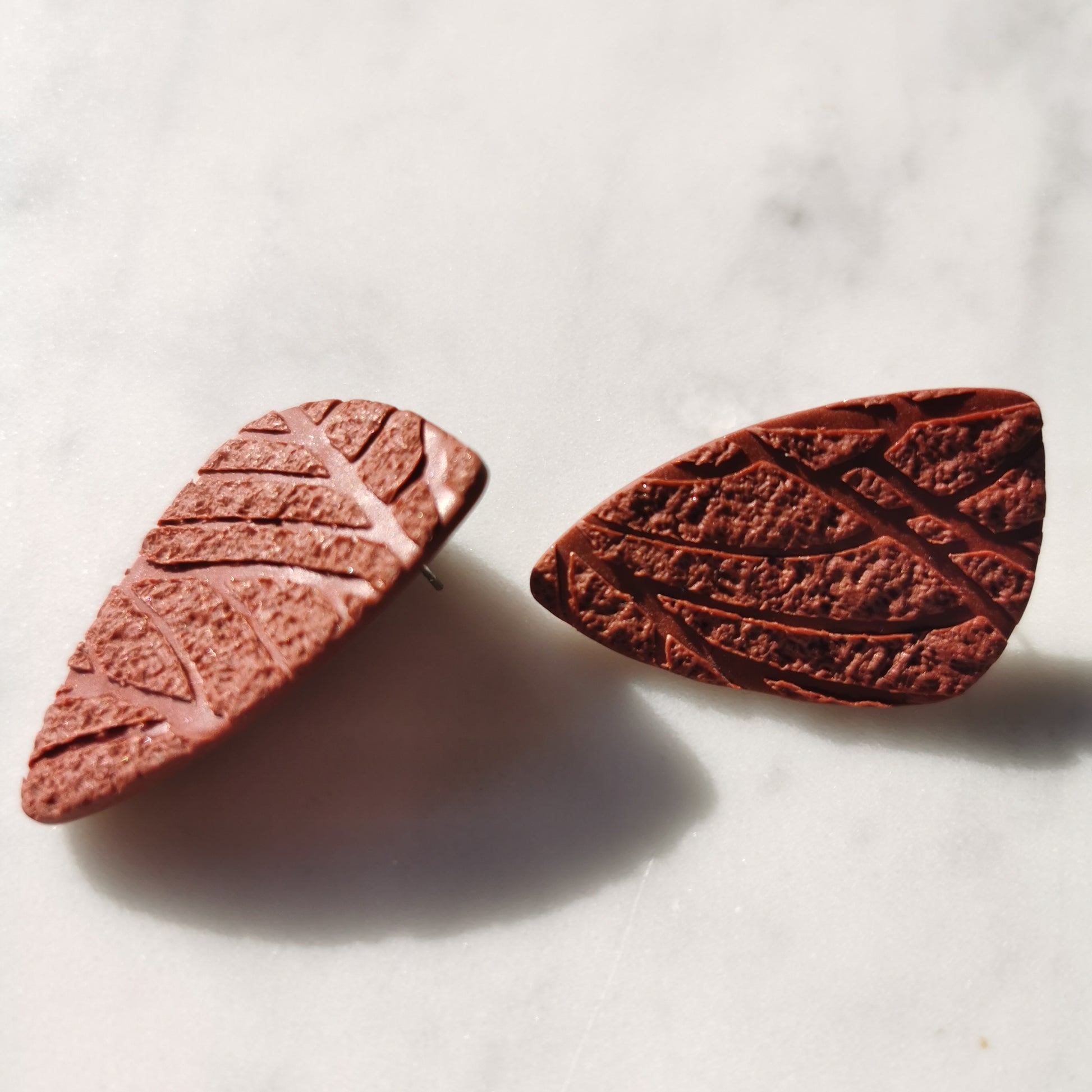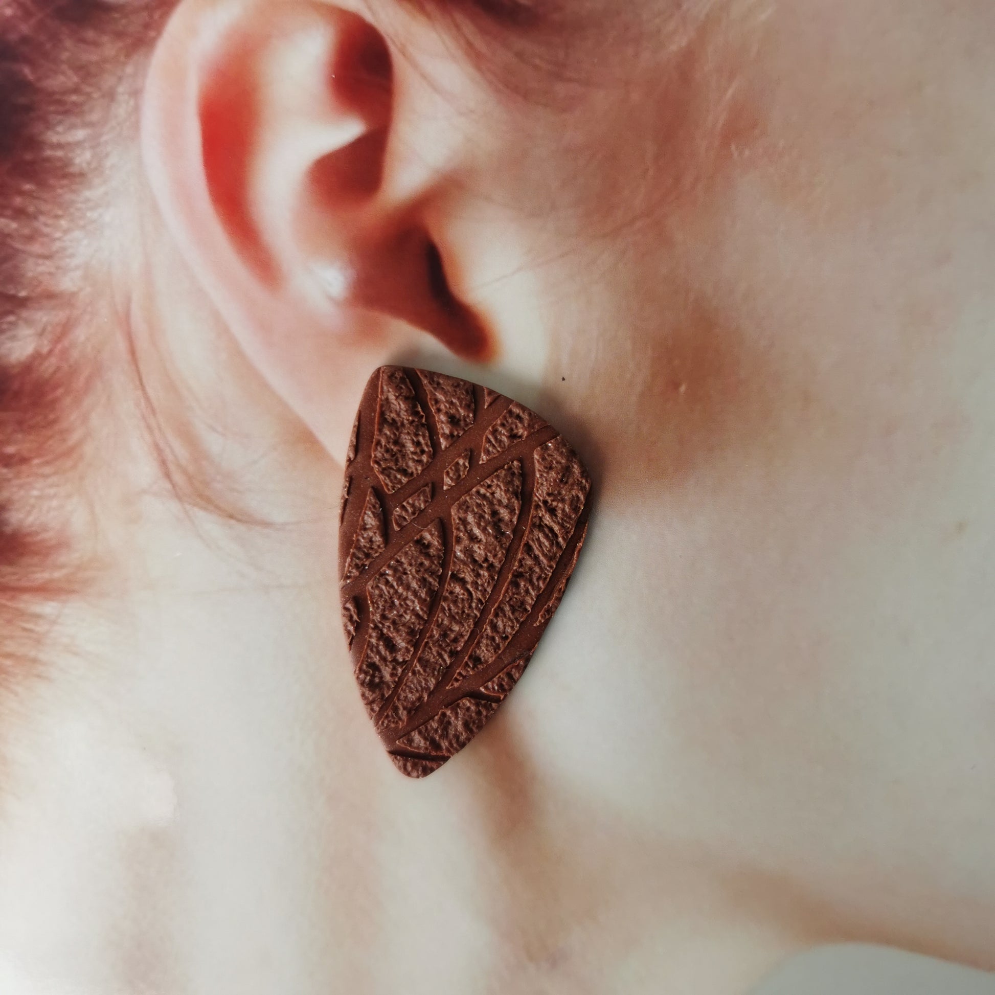 De 'aztec' maxi stud heeft een grovere textuur, een 3d print en een hele mooie diepe bordeaux kleur. Door zijn vorm is hij super flatterend aan het gelaat.