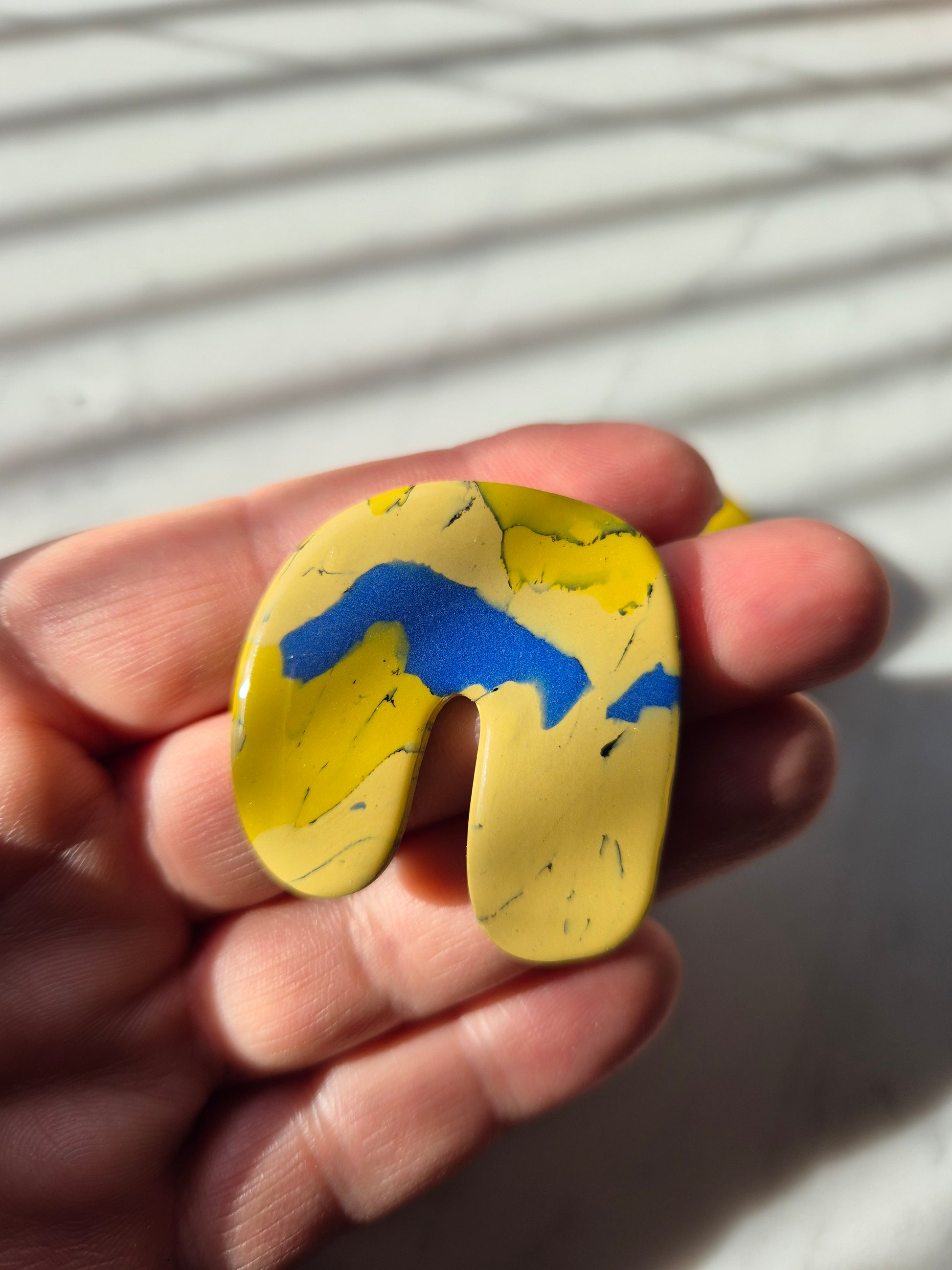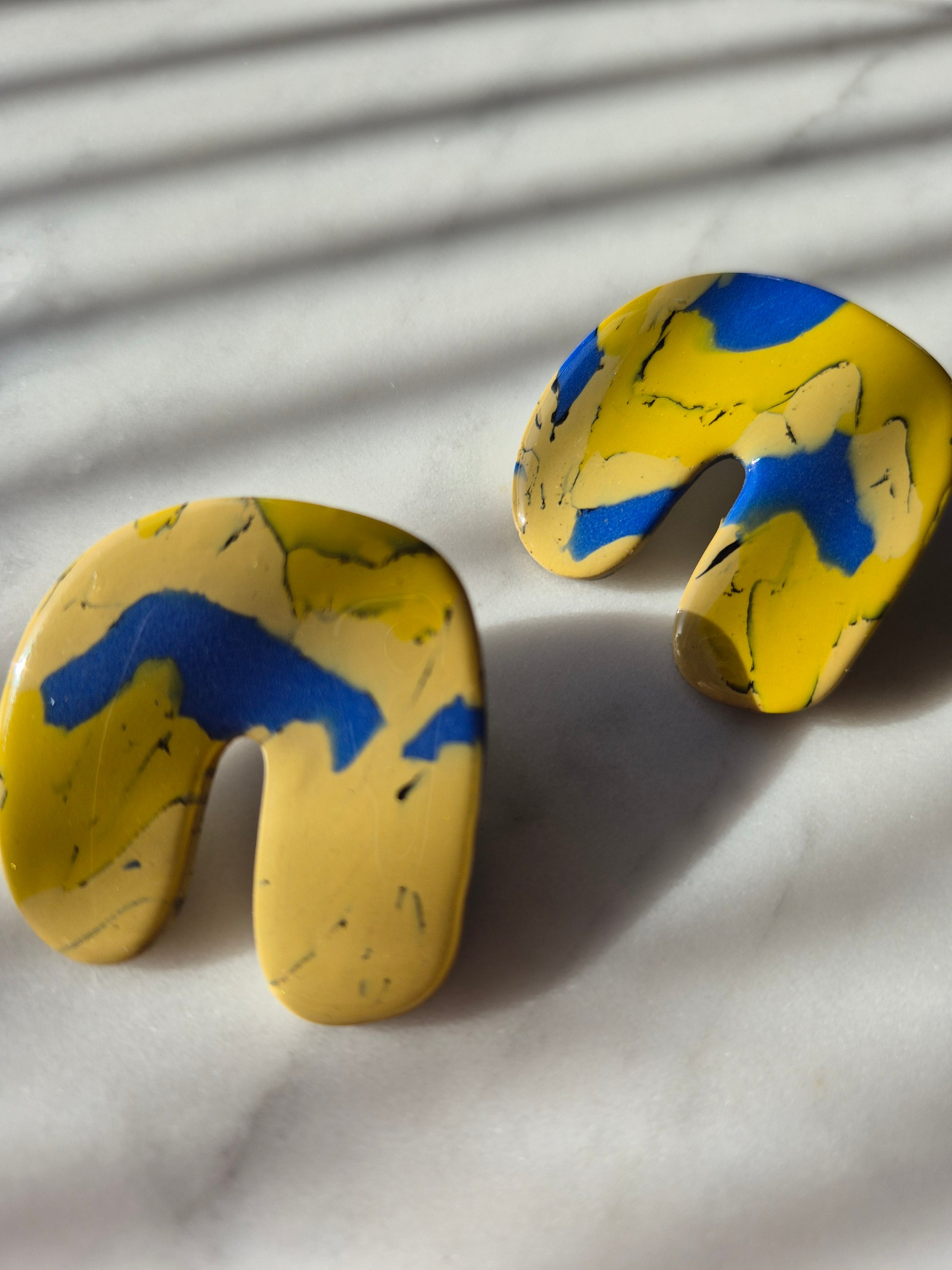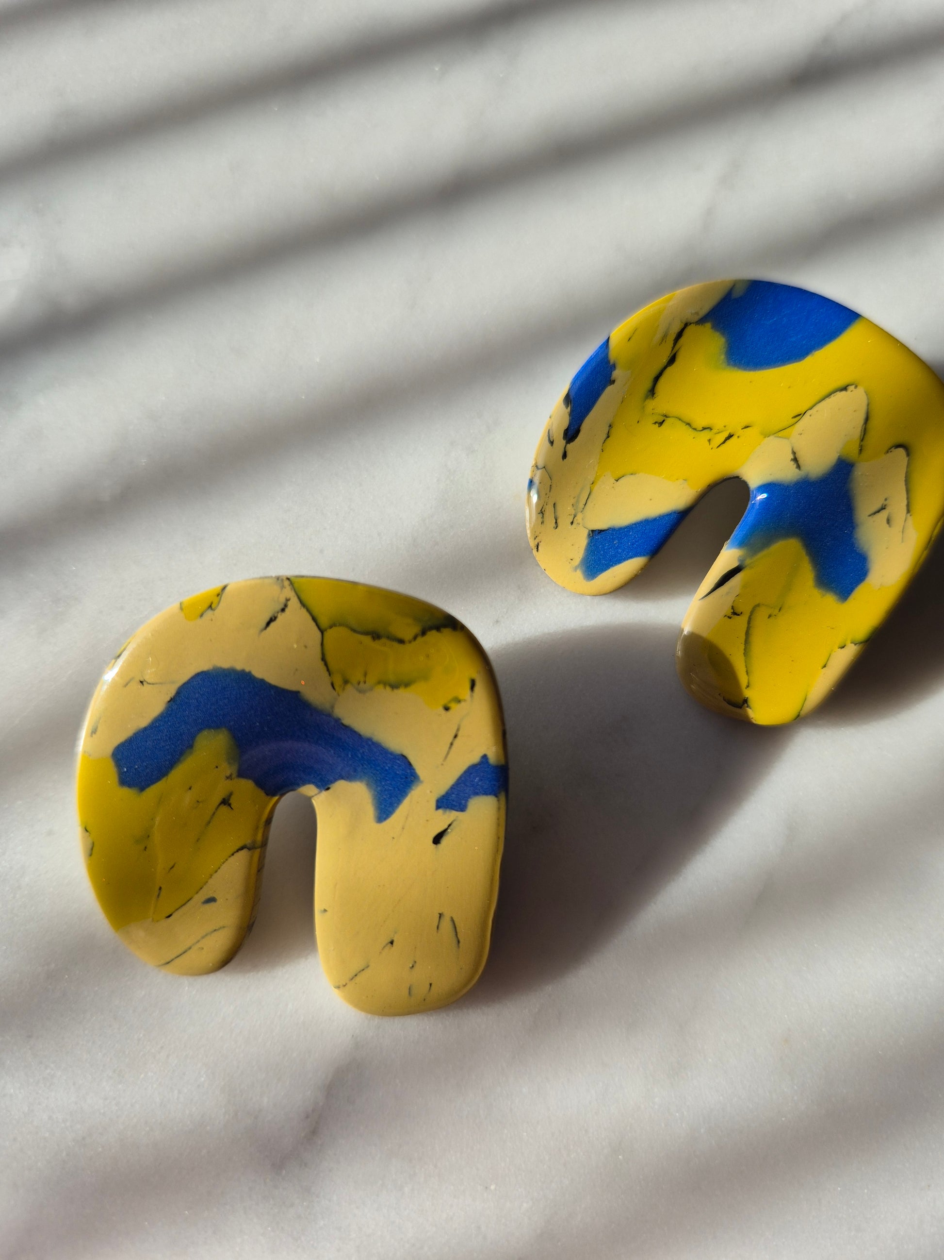 Grote boogvormige chubby statement studs met electric blue en warm olijf en okergeel. Groot maar licht om te dragen. Allen uniek in kleur en patroon. 2 exemplaren.