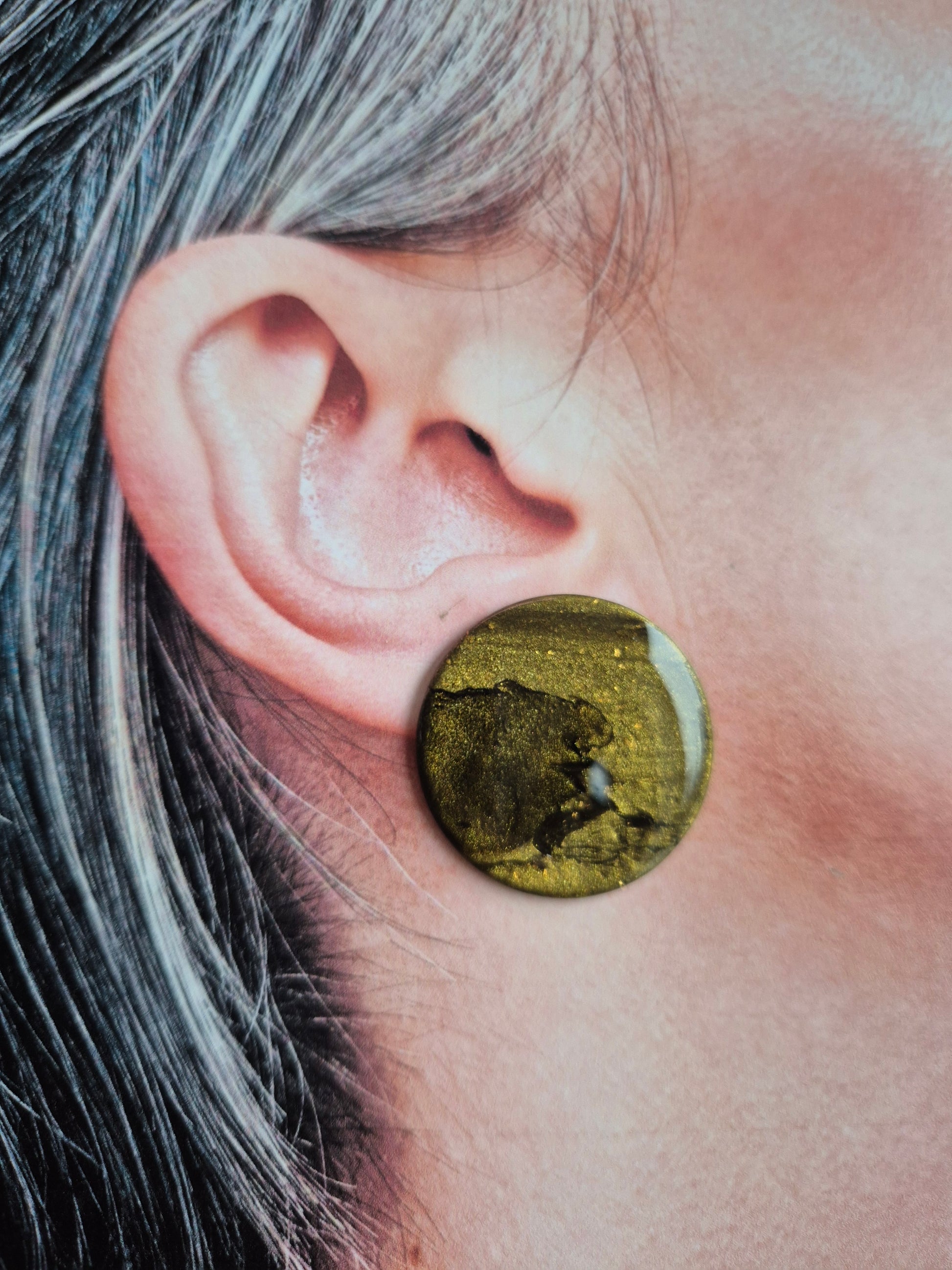 Donkerbrons-goudkleurige stud met fauxstone effect. Unieke tekening en mooie understated kleur. Er zit een prachtige schittering in.