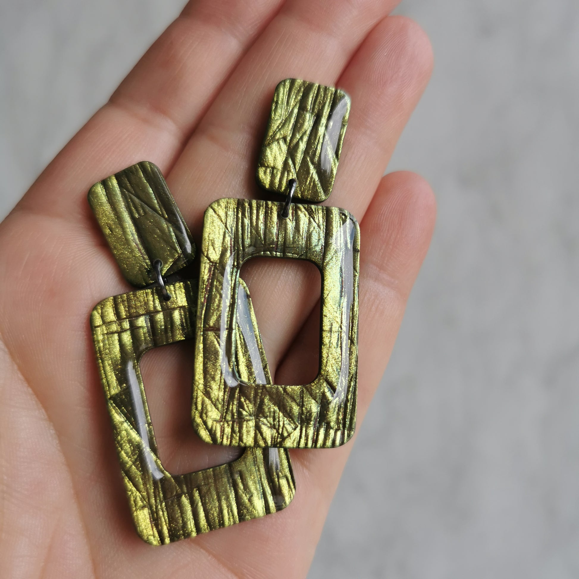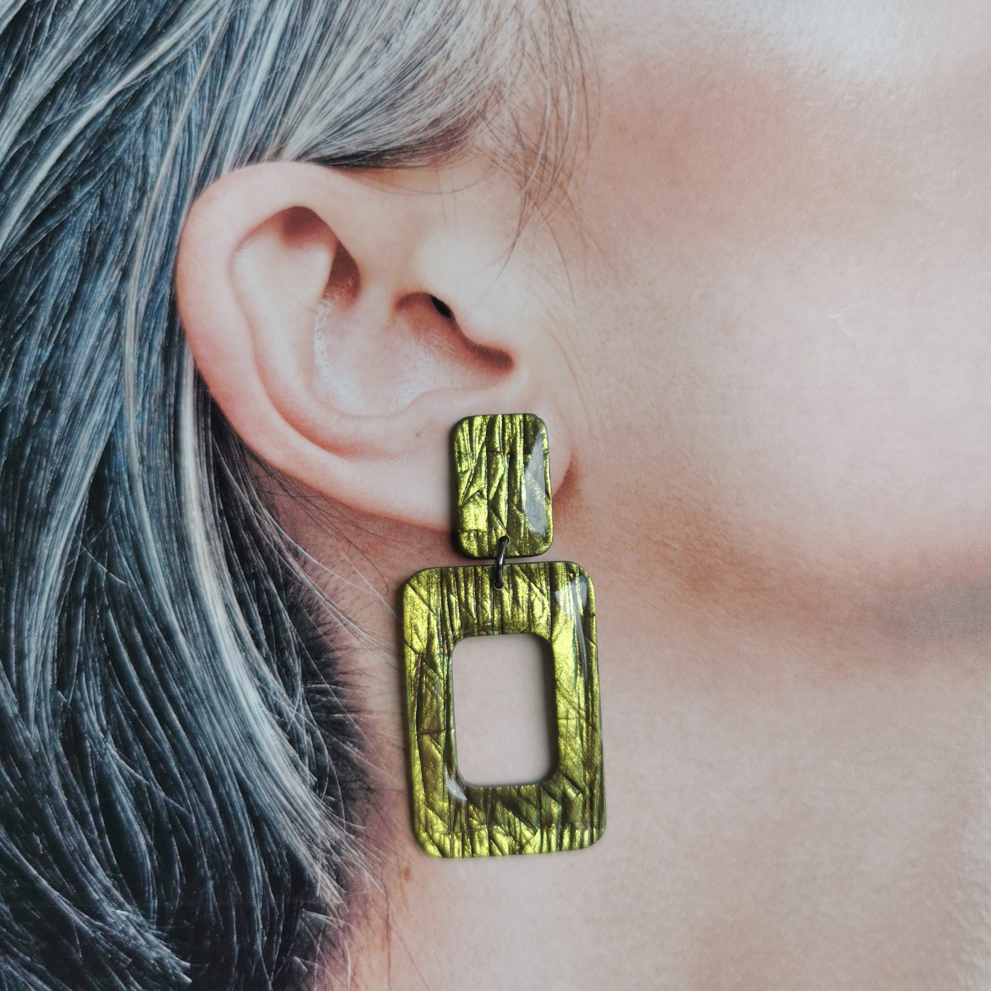 In de famalie van de colorshift heb ik ook een paar hangers gemaakt. Rechthoekig van vorm,een ware statement oorbel. De kleur schakeert van kakigroen naar chartreuse groen naar aqua blauw. Prachtige exemplaren.