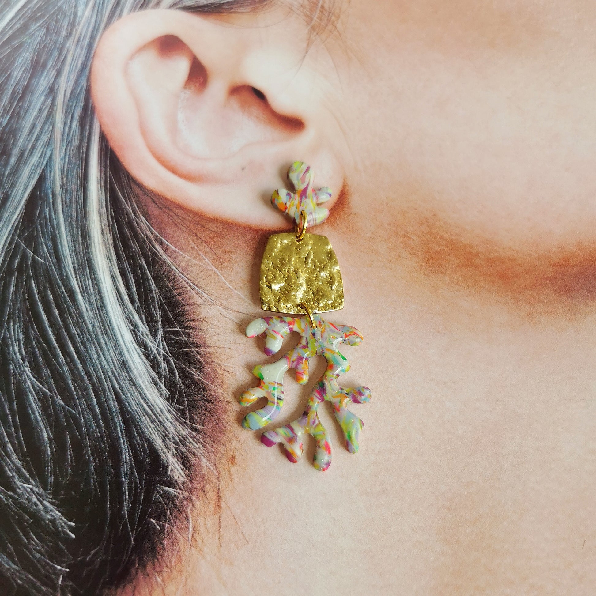 Hou je van sierlijk, vrouwelijk maar toch vrolijk gekleurd. Deze oorbellen hebben het allemaal. Heel erg elegant om te dragen terwijl je toch de vrolijkheid behoudt. Hanger met gouden bedeltje. Met resin verwerkt.