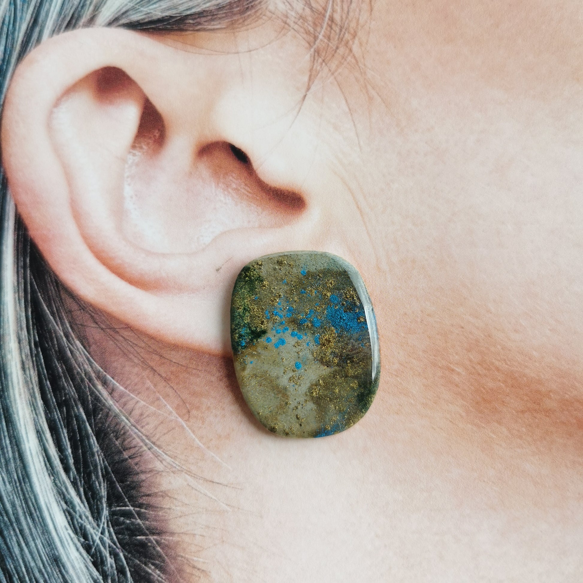 Unieke studoorbel met shimmer pigment. Tinten van kaki en goud met een hint vzn hevug blauw. Echt unieke stuks in kleur en uitvoering. Afmeting 3cm op 2cm