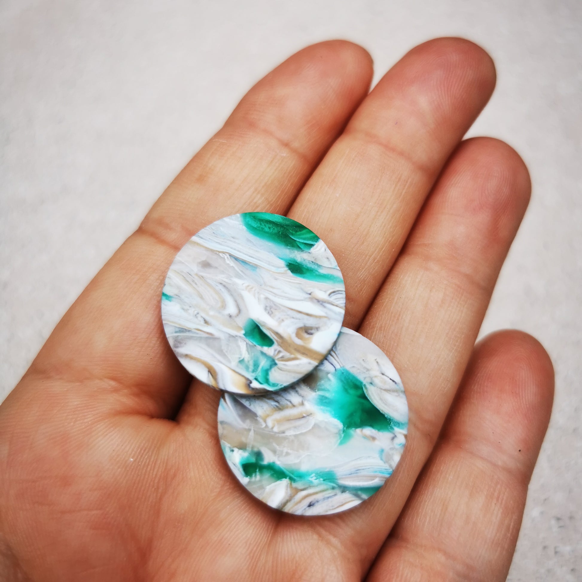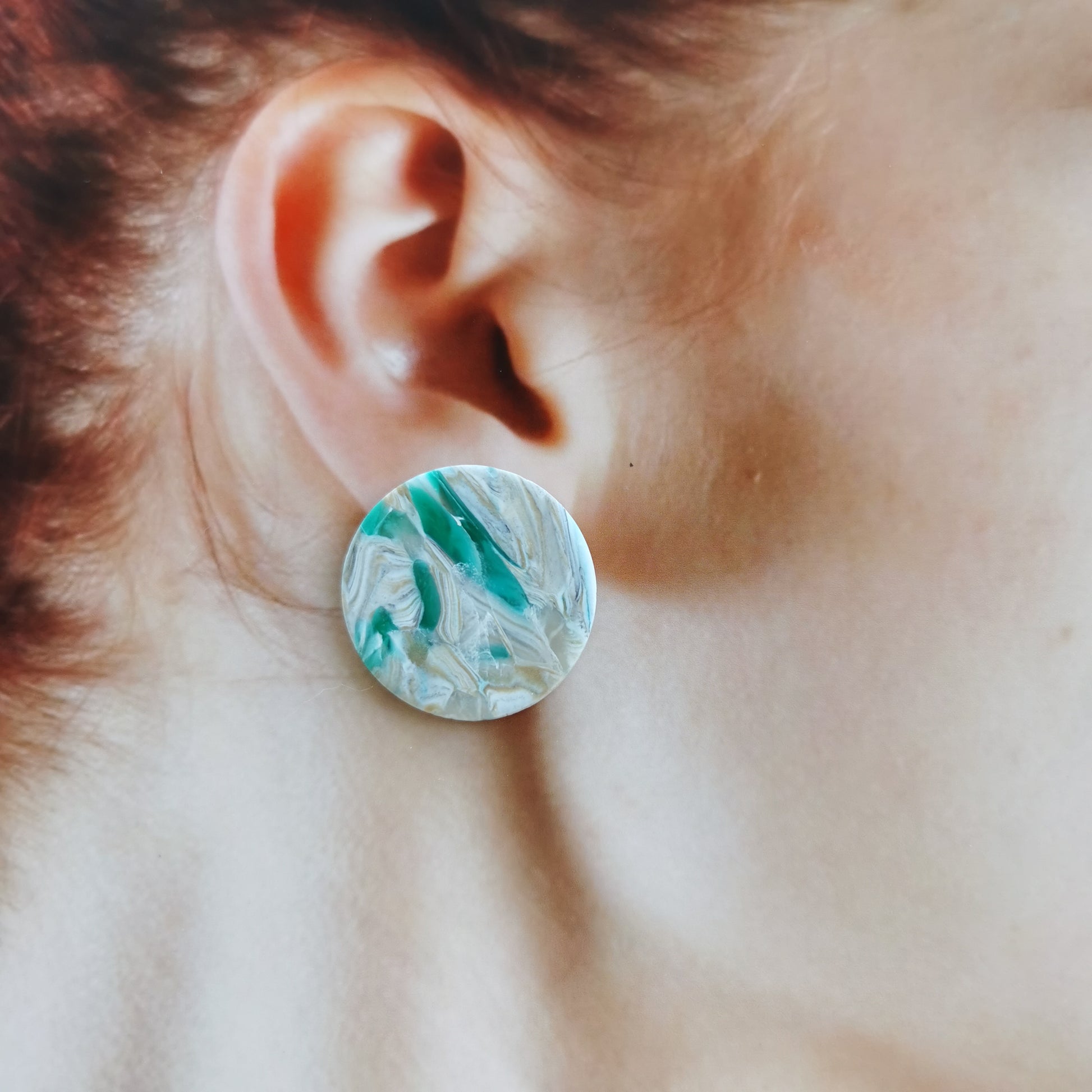 Prachtige kleuren in deze maxi oorbel stud. Een mix van neutraal beige, transparant wit en een touch van smaragdgroen. Matte finish. 2,5cm