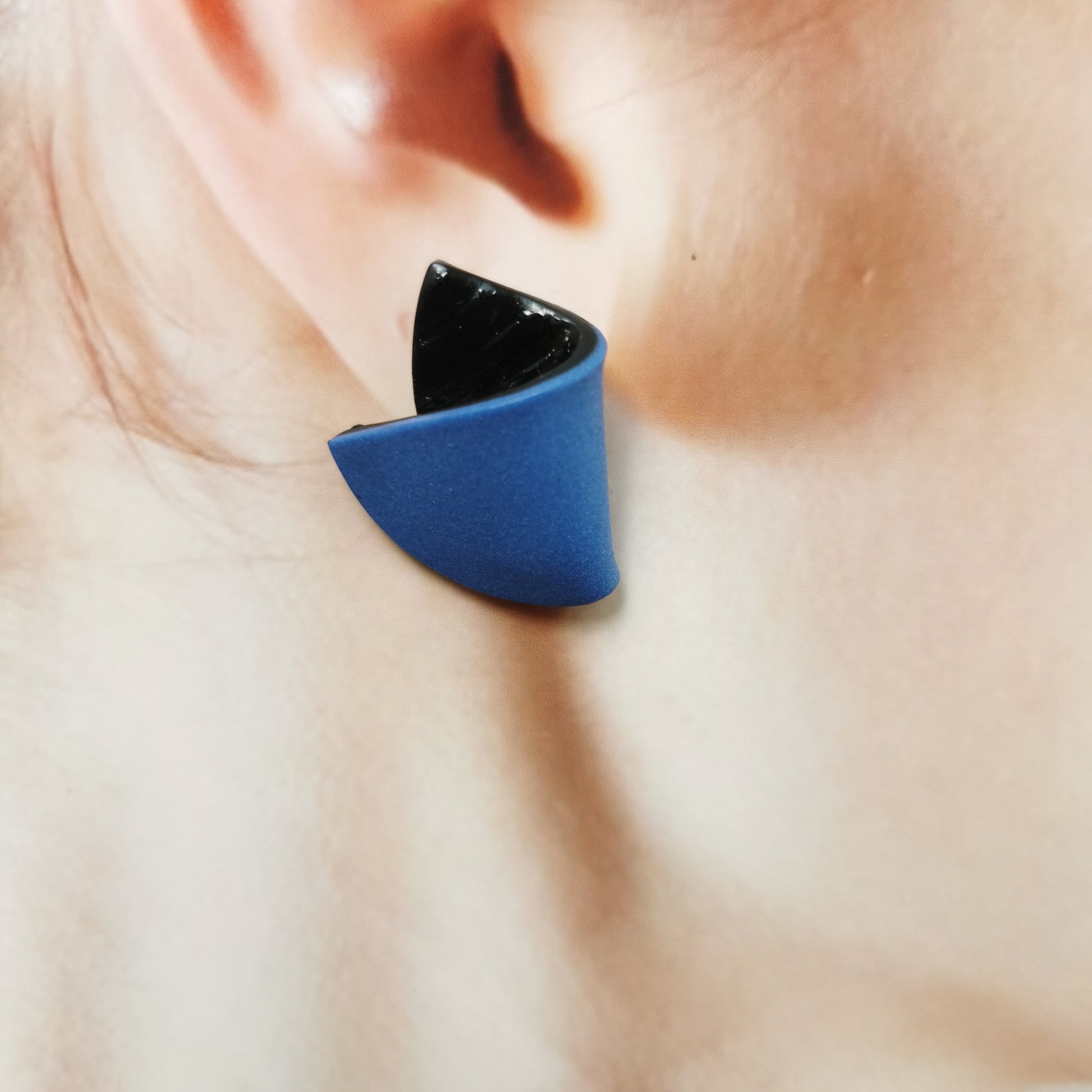 3d vormgegeven studs. Buitenkant fel lauw, binnenkant glanzend zwart met textuur.