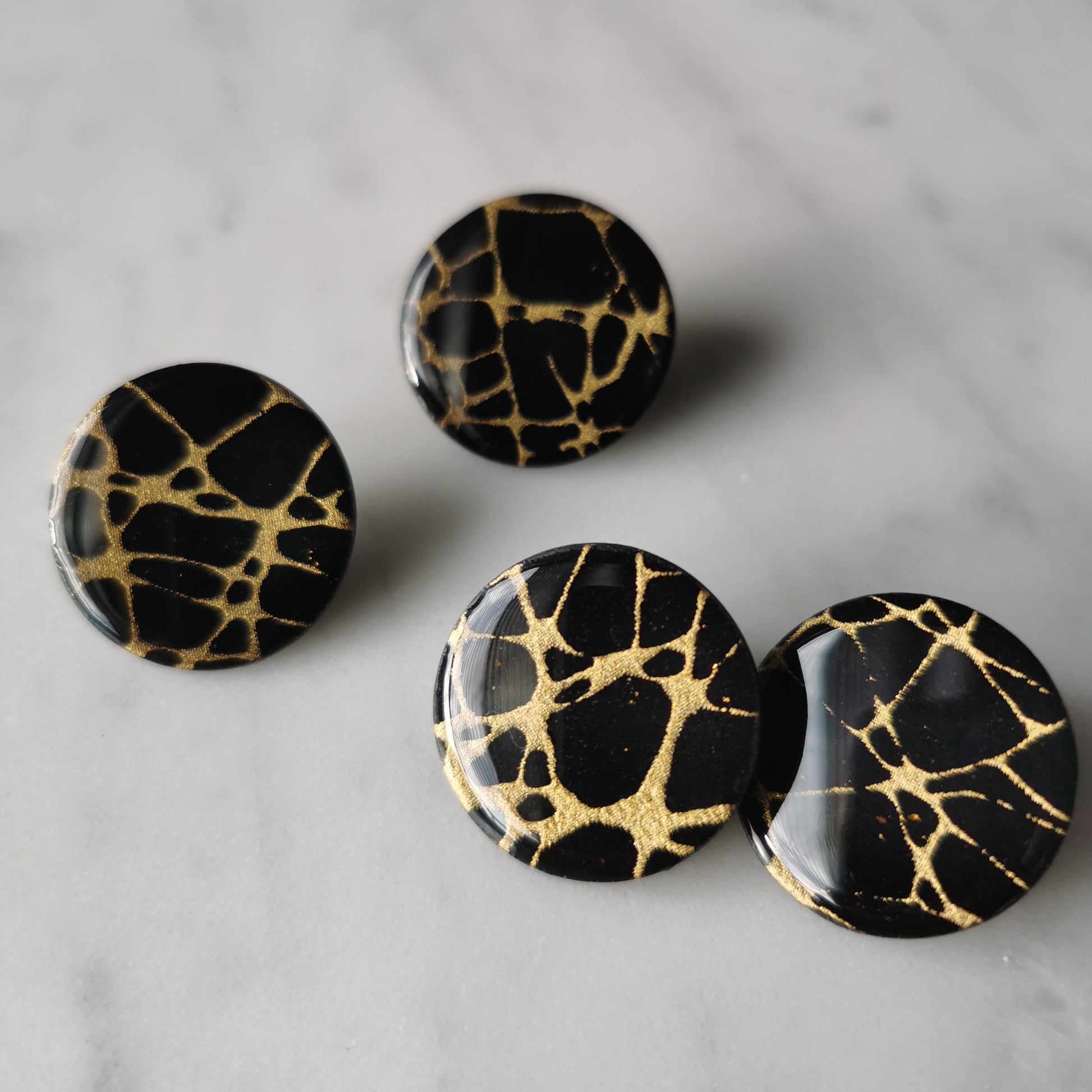 Hele draagbare stud met zwart en gouden 'kintsugi' print. Afgewerkt met een harslaagje en een hele draagbare grootte.