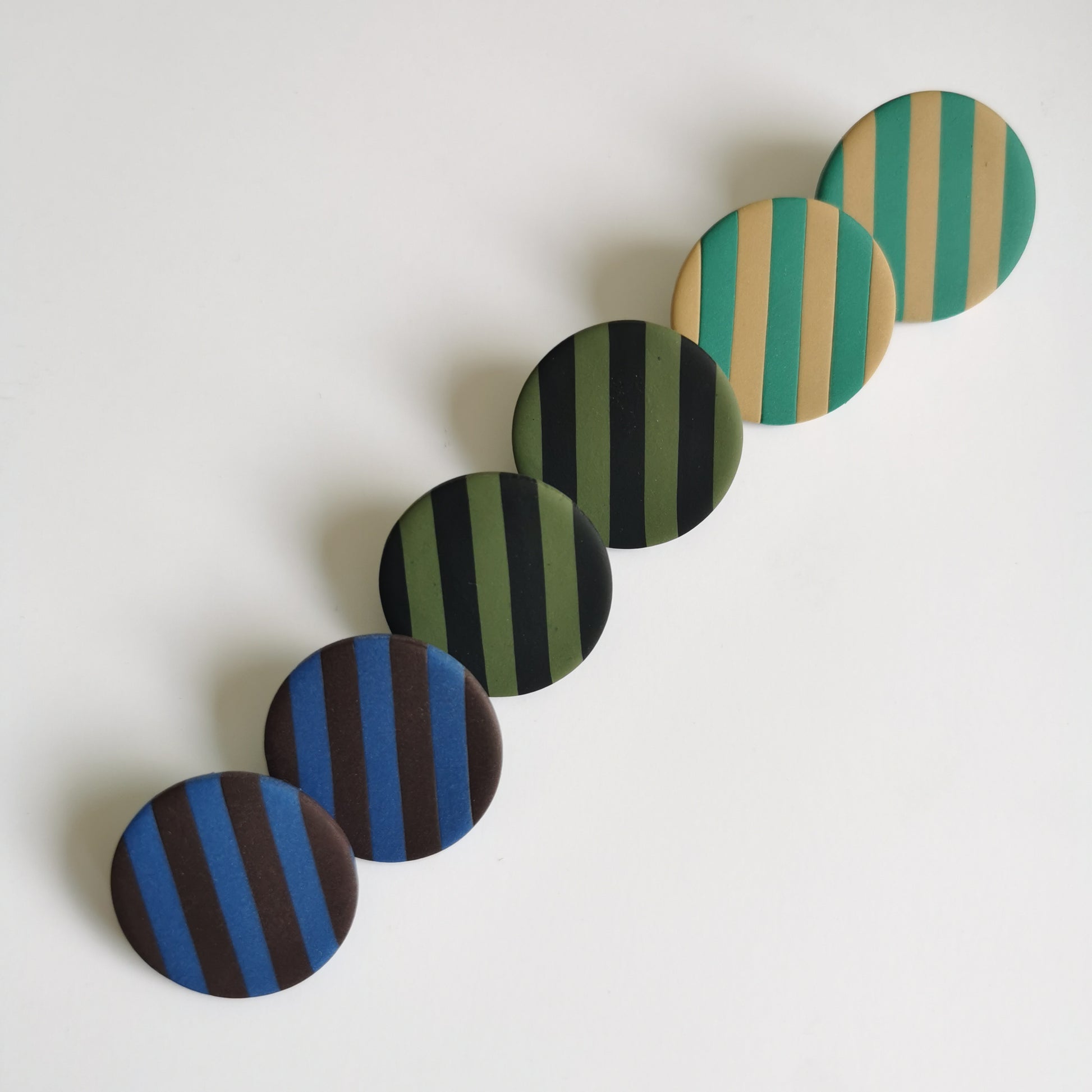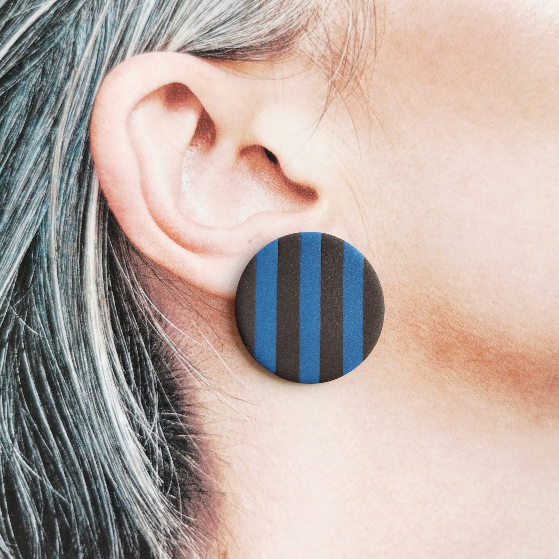 De kleinere versie van deze leuke gestreepte studs. De streepjes zijn verticaal aan beide kanten. Diameter is ong. 3cm, dus erg draagbaar! Ze zijn leuk!