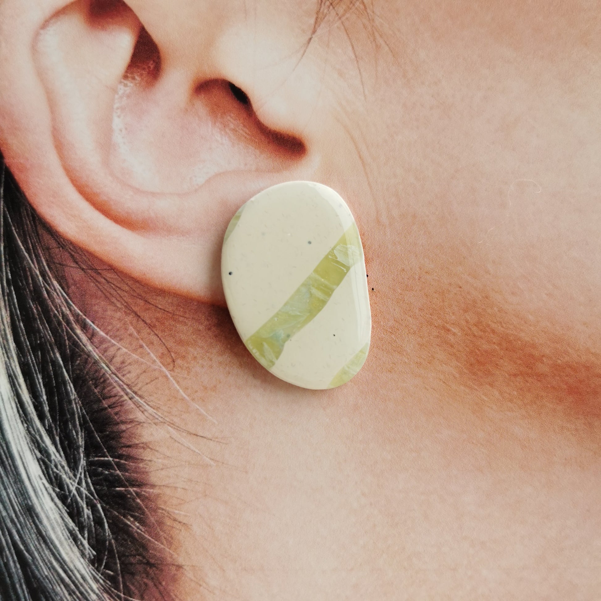 Heel zacht van kleur zijn ze. Zachte sage met gebroken wit. Ronde versie en 'pebble' versie. De tekening is assymetrische en anders in elke oorbel.