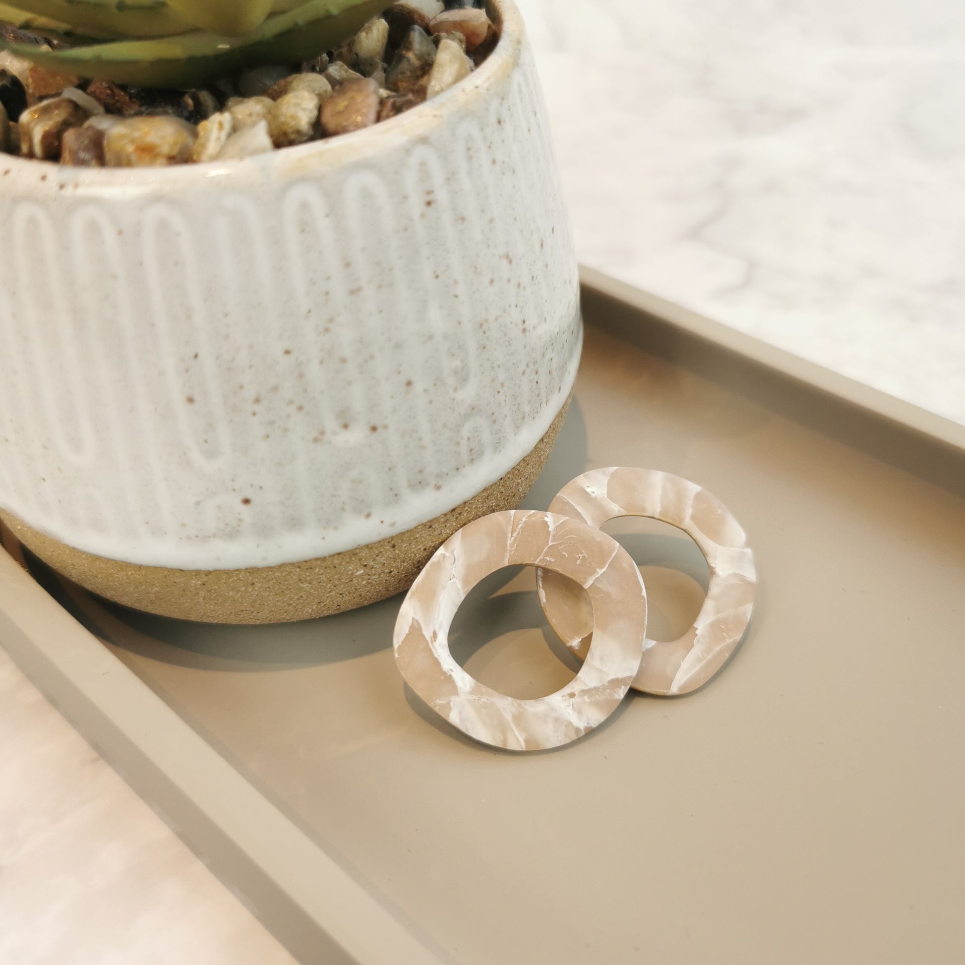 Organische peekaboo doorkijk stud in quartz. De afwerking is mat en ze zijn lichtdoorlatend. Heel erg mooi effect.