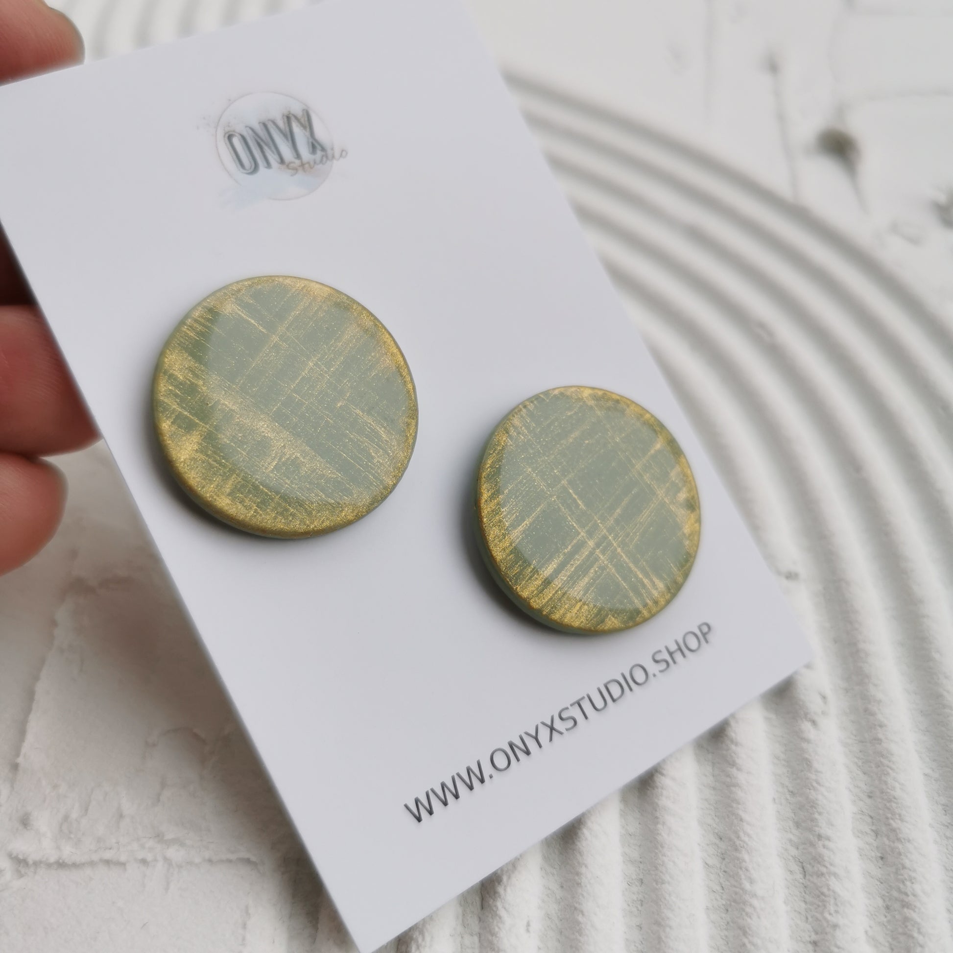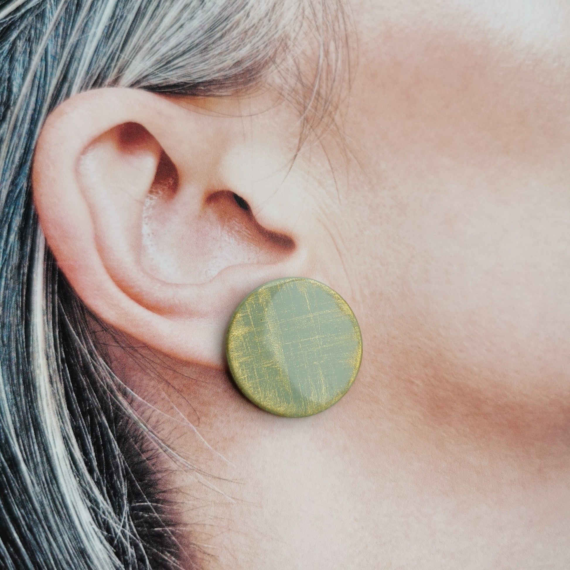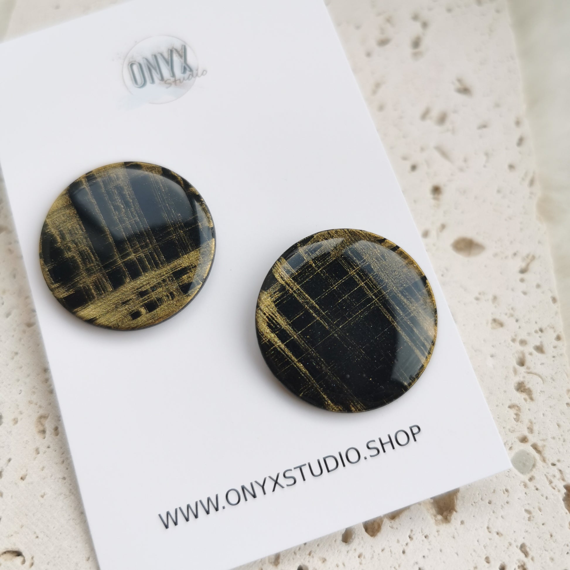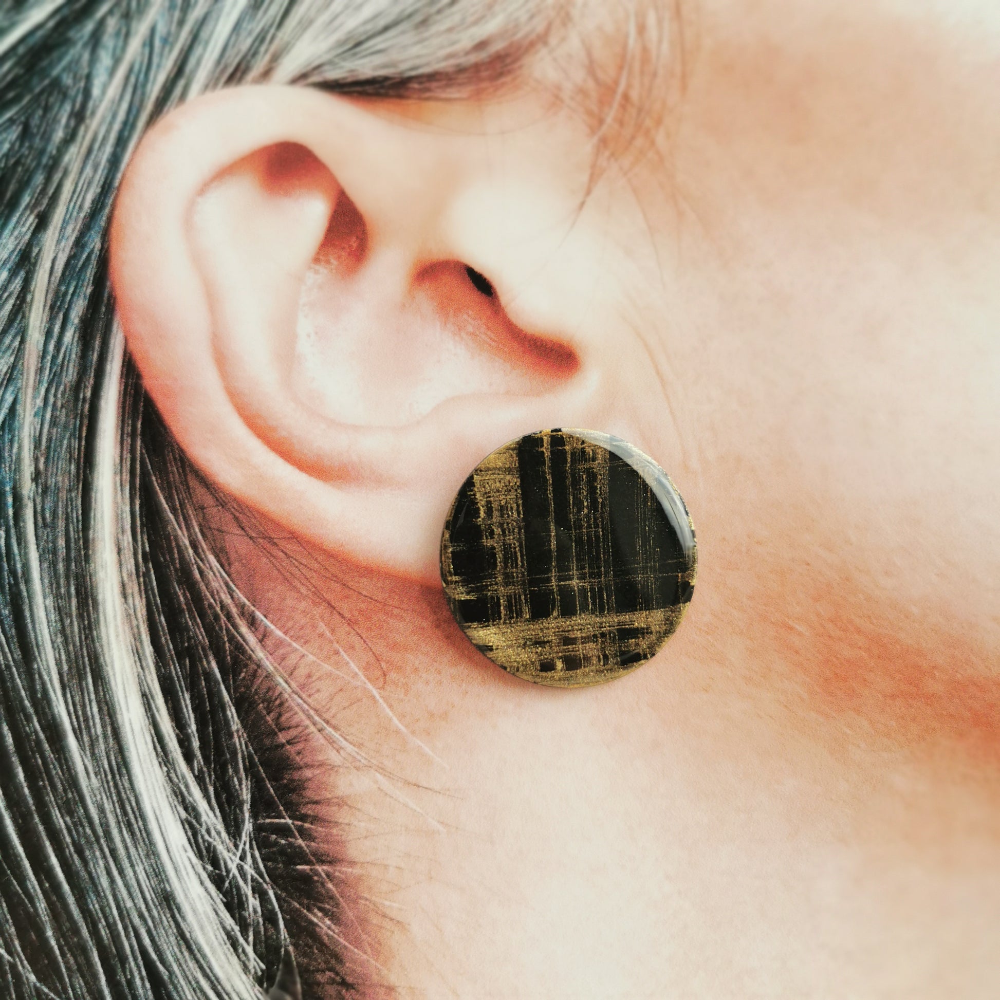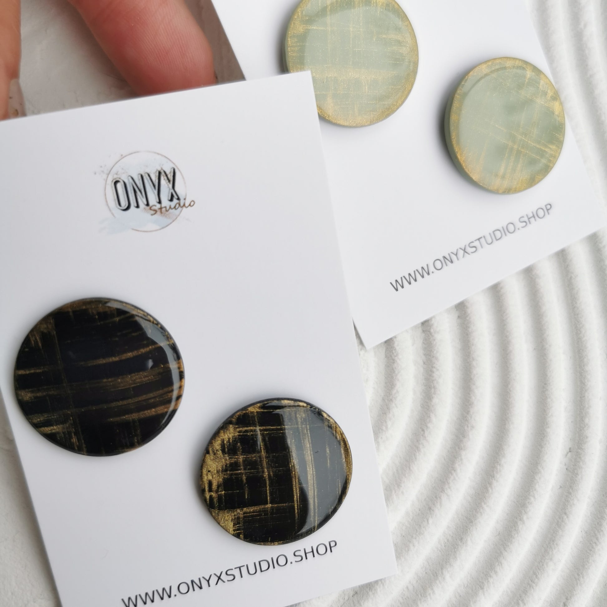 Deze maxistud is een hele mooie,understated stud met de mooiste subtiele gouden print. Door het toplaagje van resin wordt het licht mooi gevangen. Ga je voor zwart of sage? 3 cm diameter