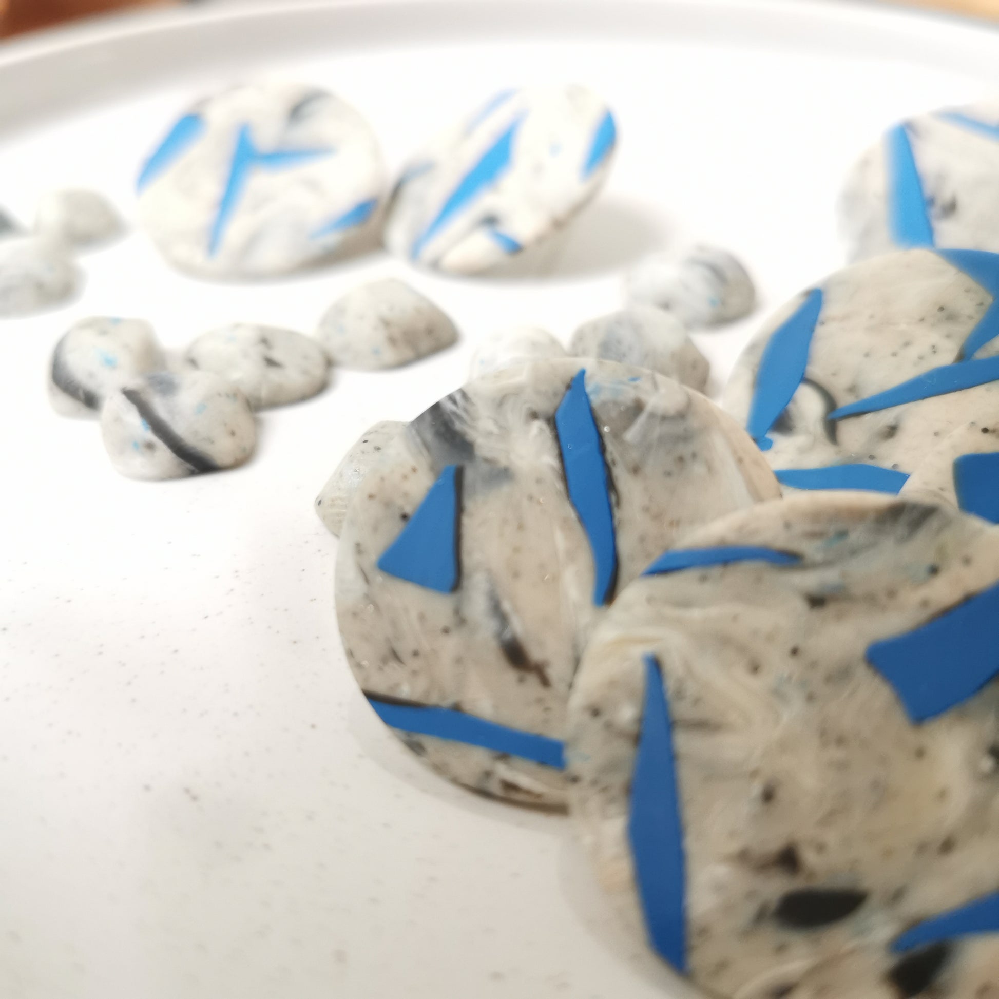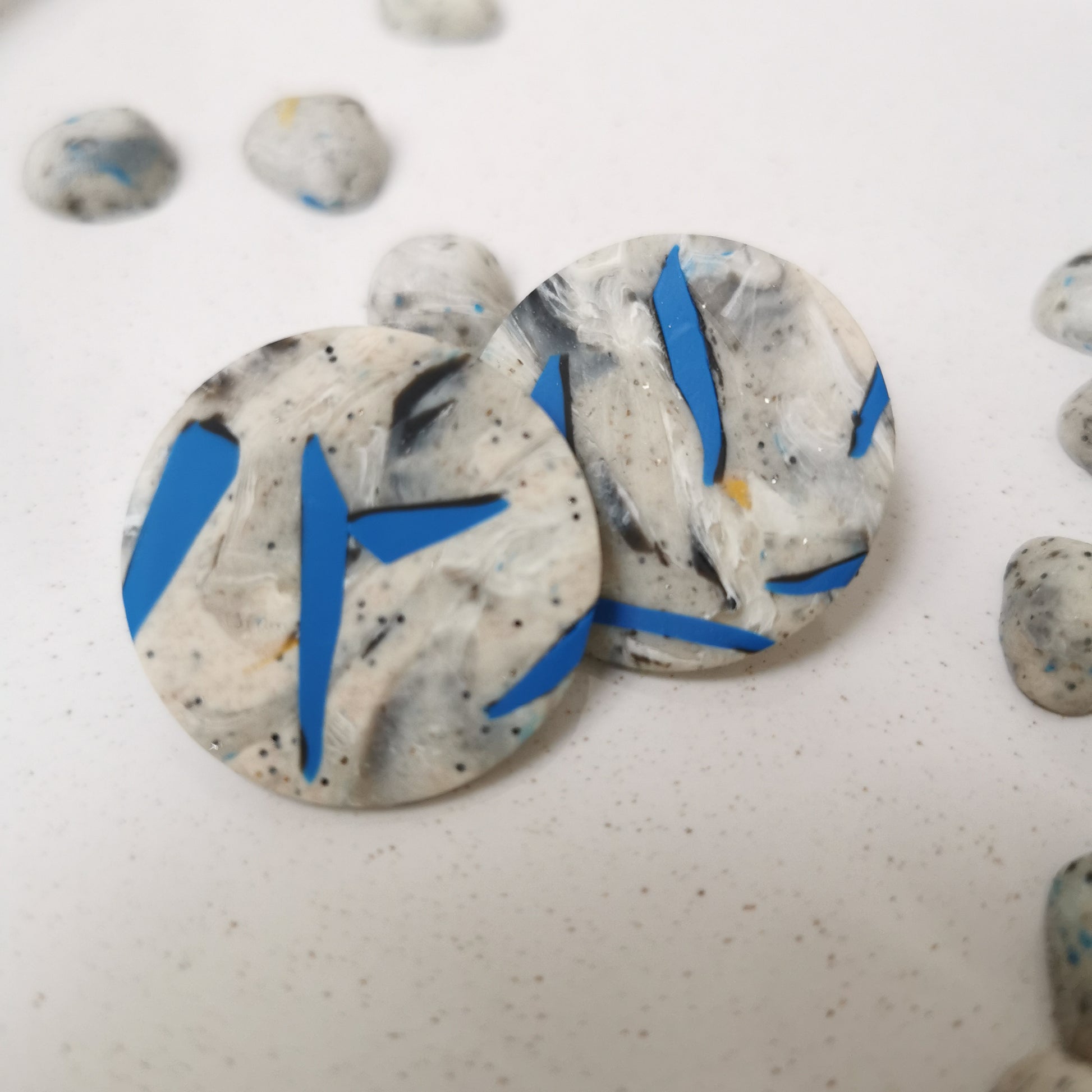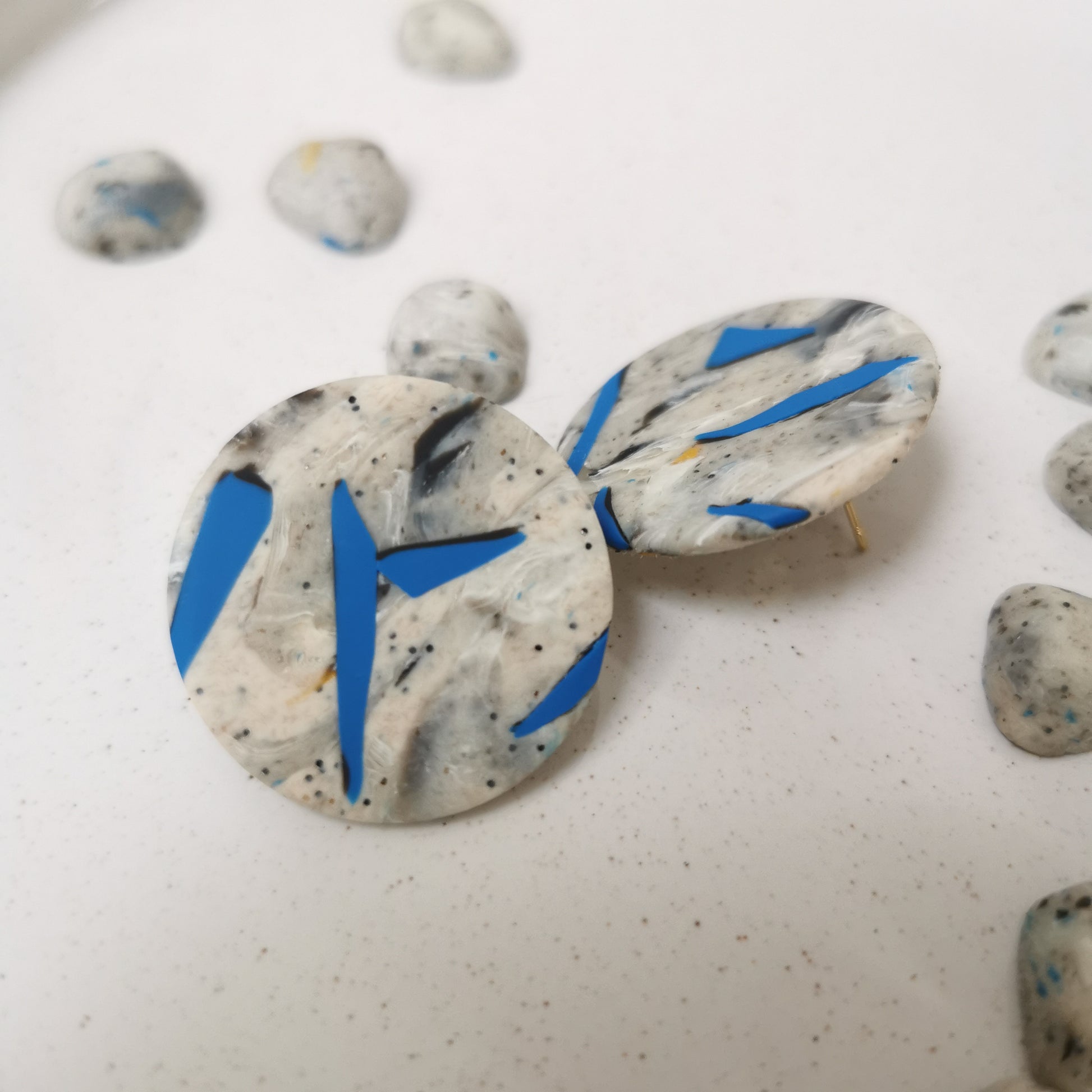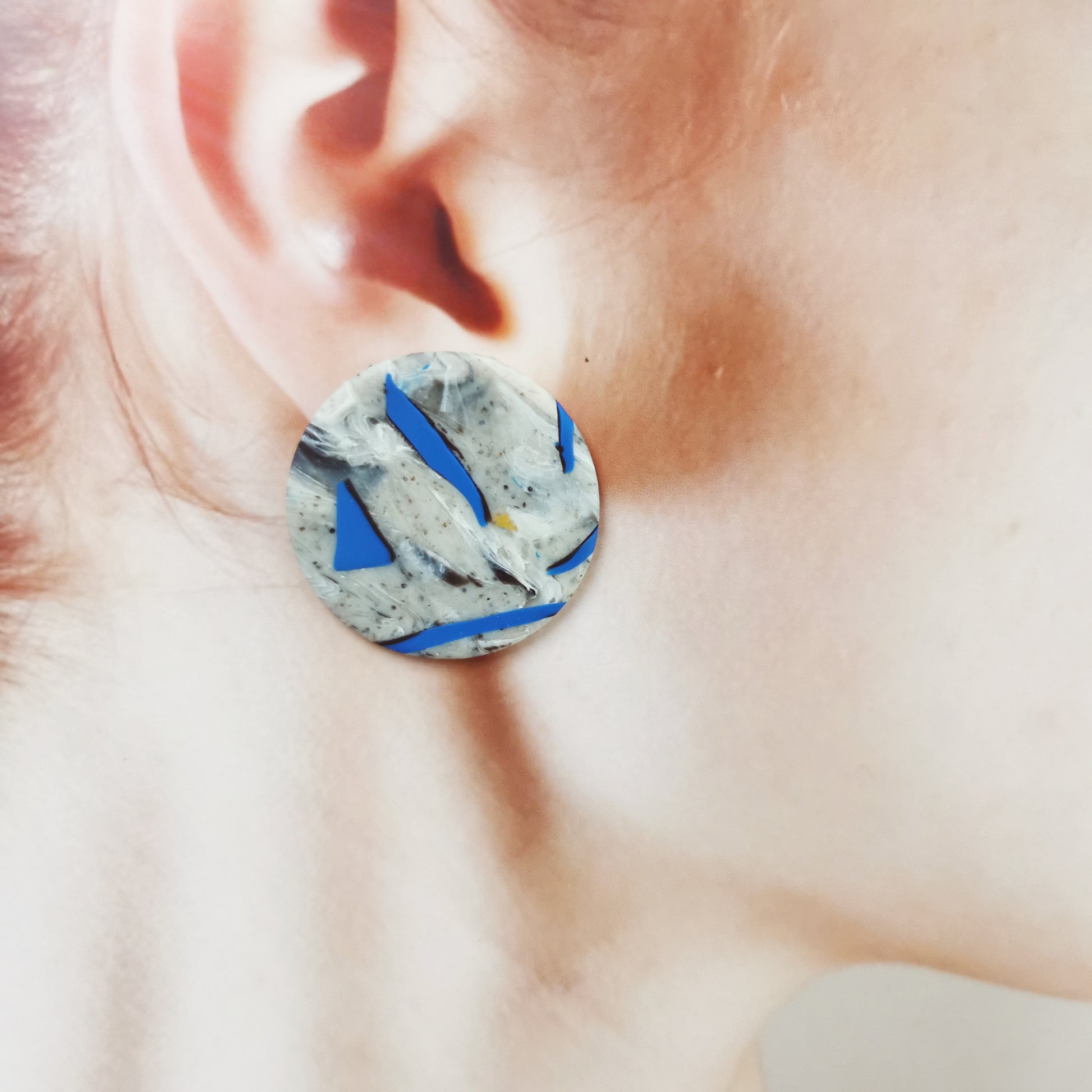 Originele maxistud oorbel met 'dalmatian stone' look en blauwe accenten. Ong. 3cm diameter.