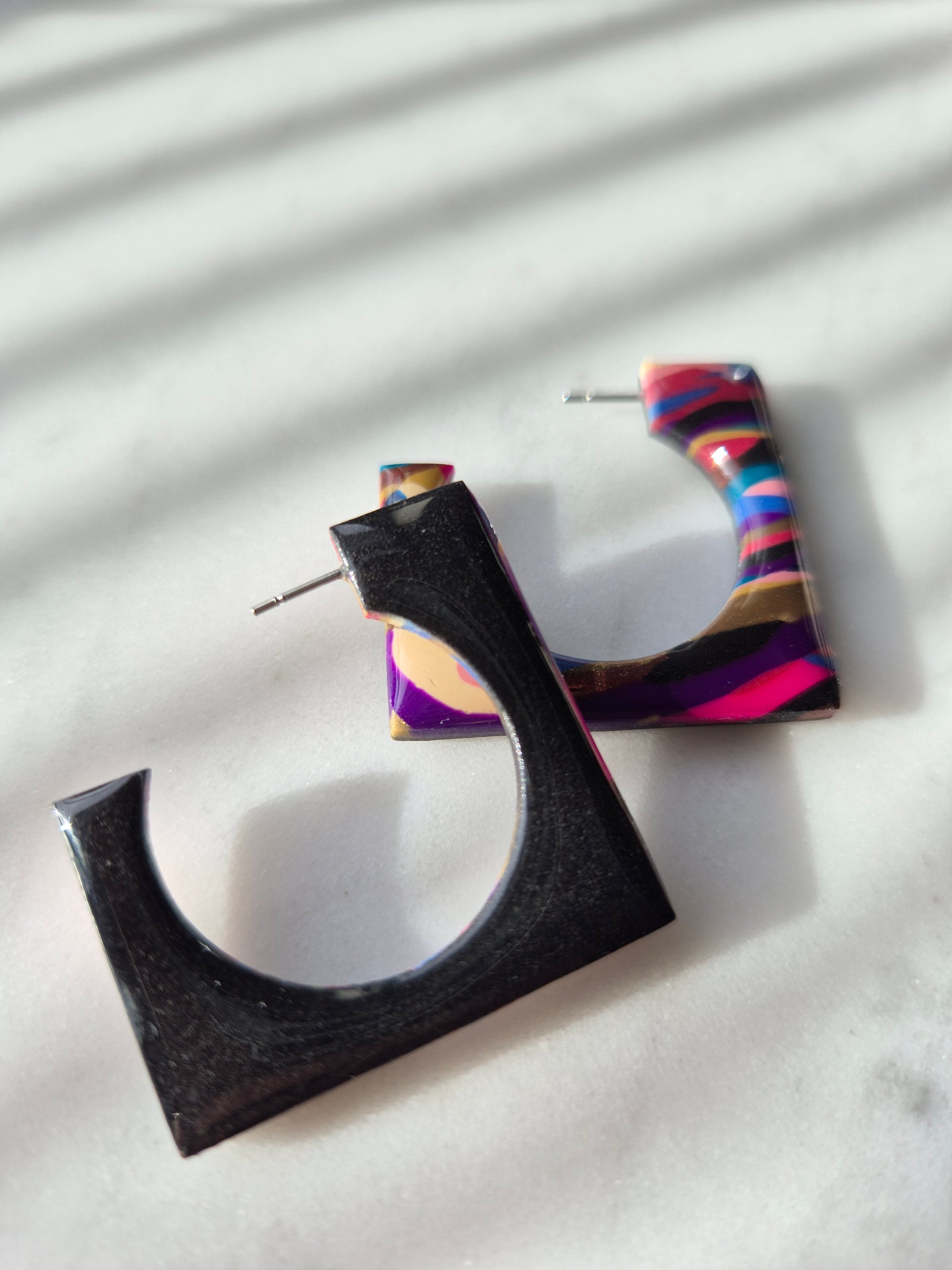 Handgesneden geometrische hoepeloorbel. Strak vierkant met 1 kant mat en 1 kant glanzend.(of print) Zo kan je kiezen welke afwerking je laat zien.