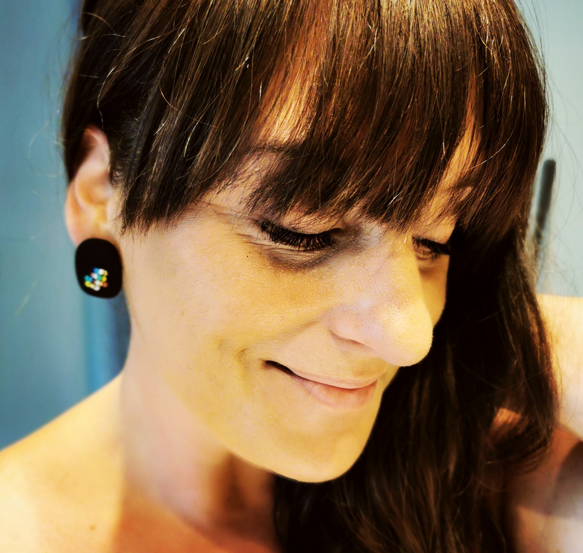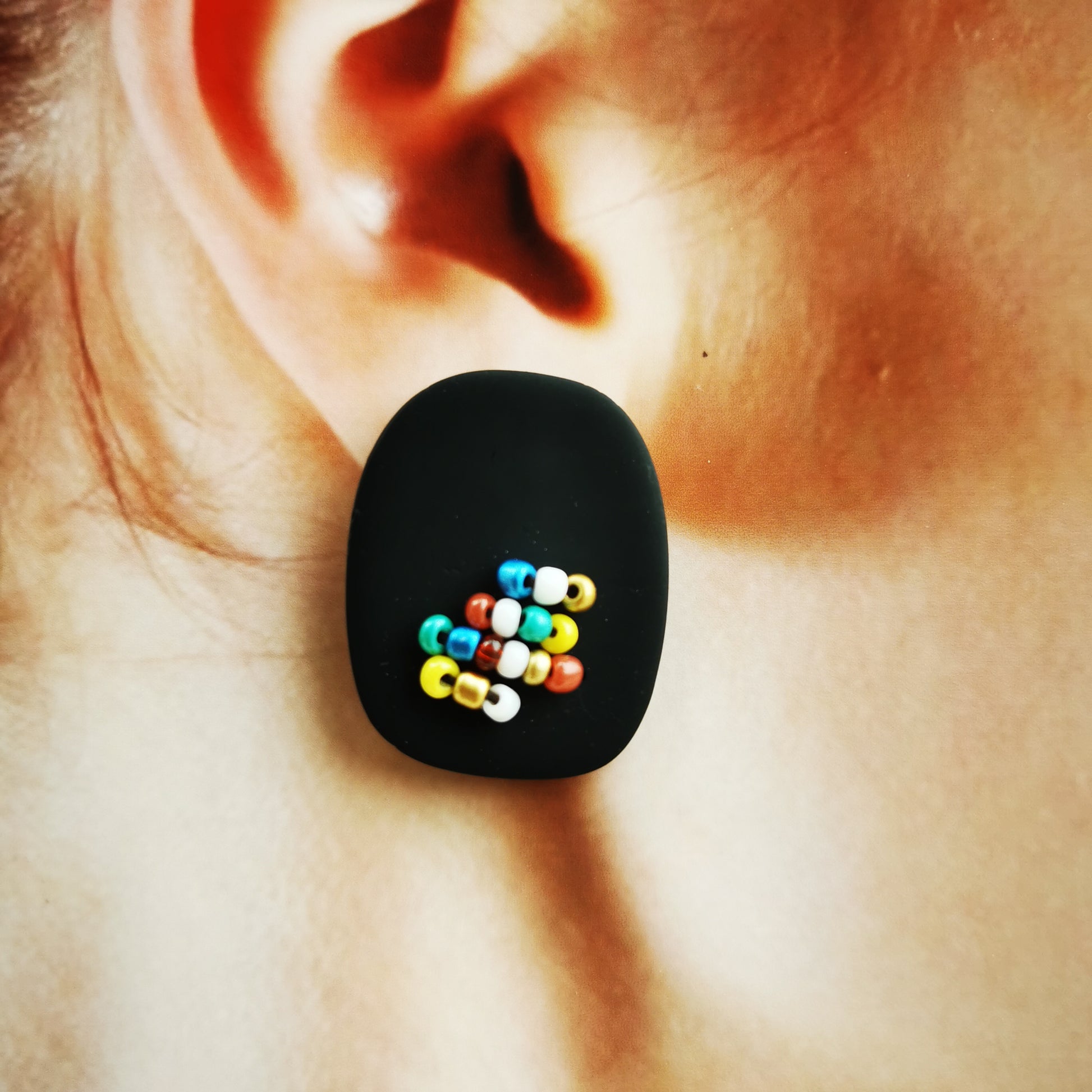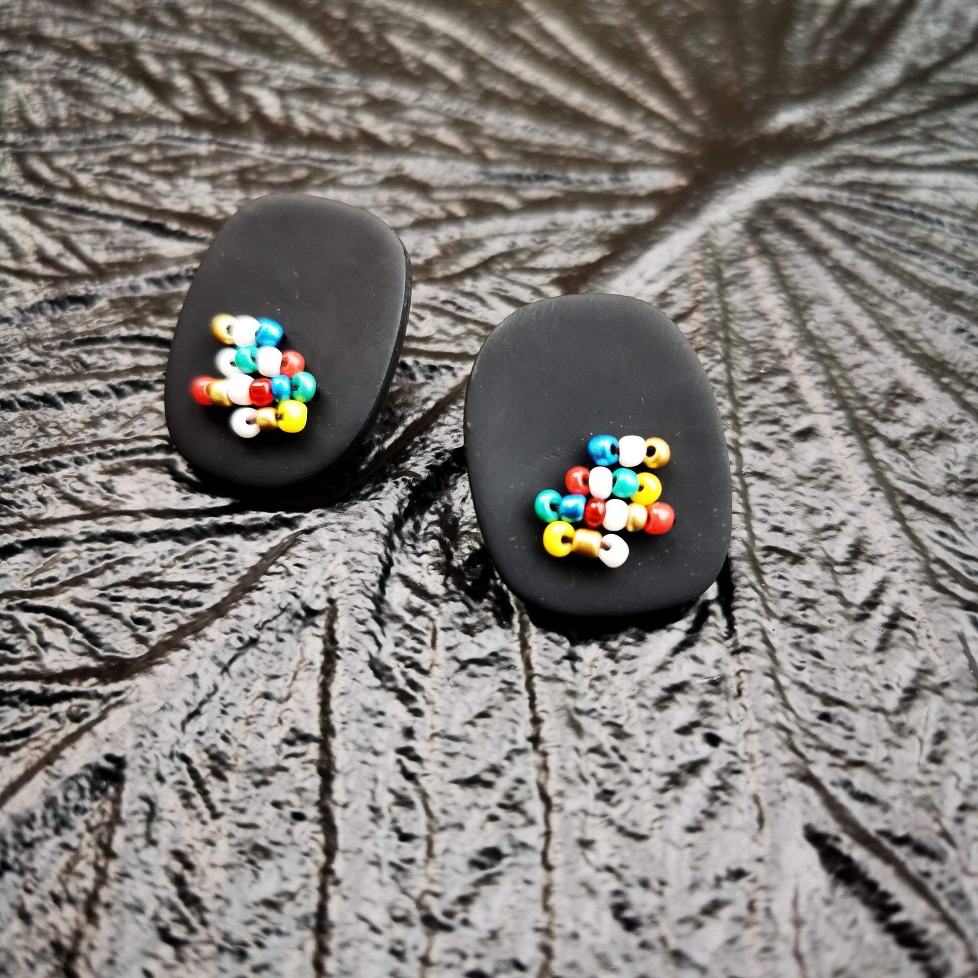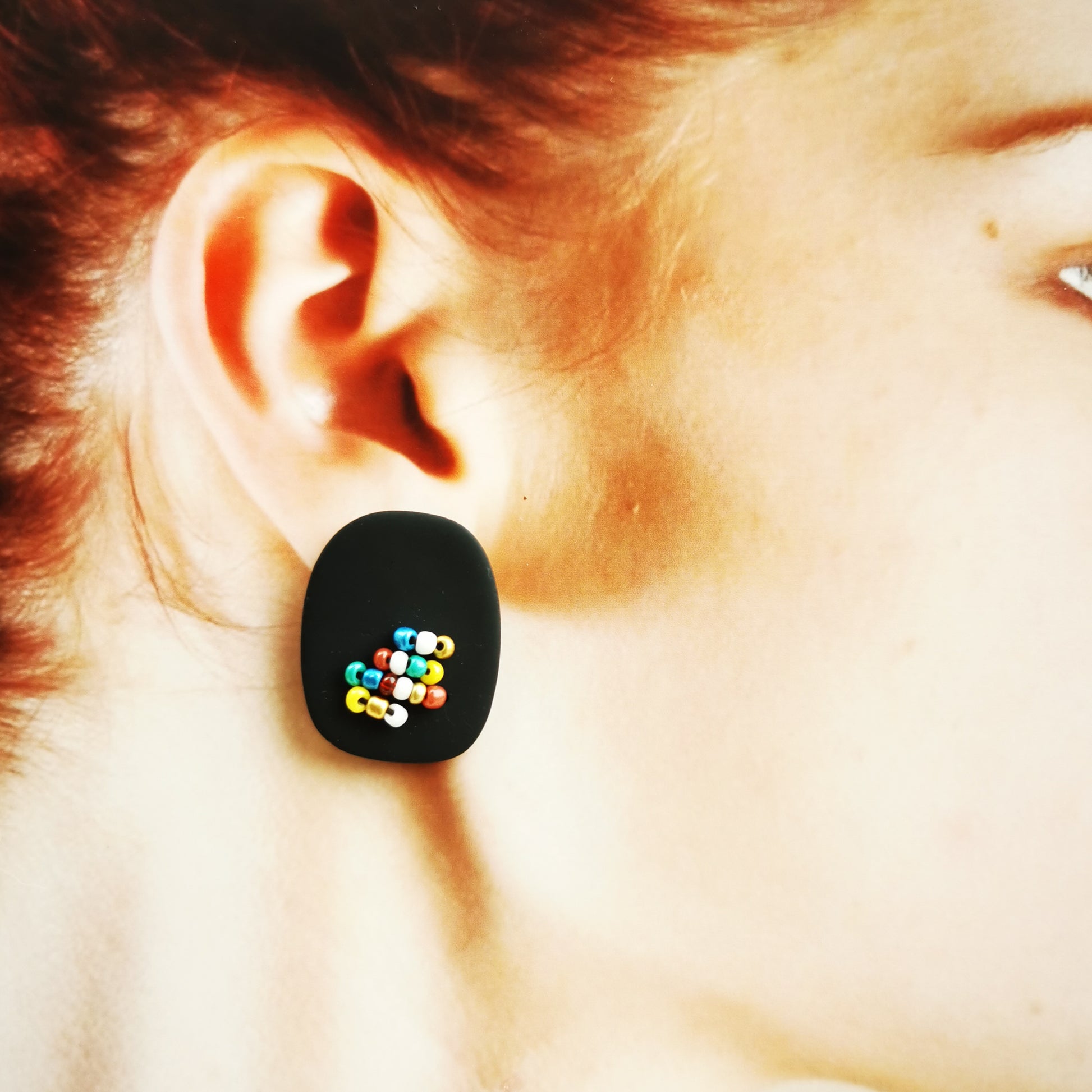 Maxistud in zwarte polymeerklei geborduurd met parels. Afmeting 3cm.