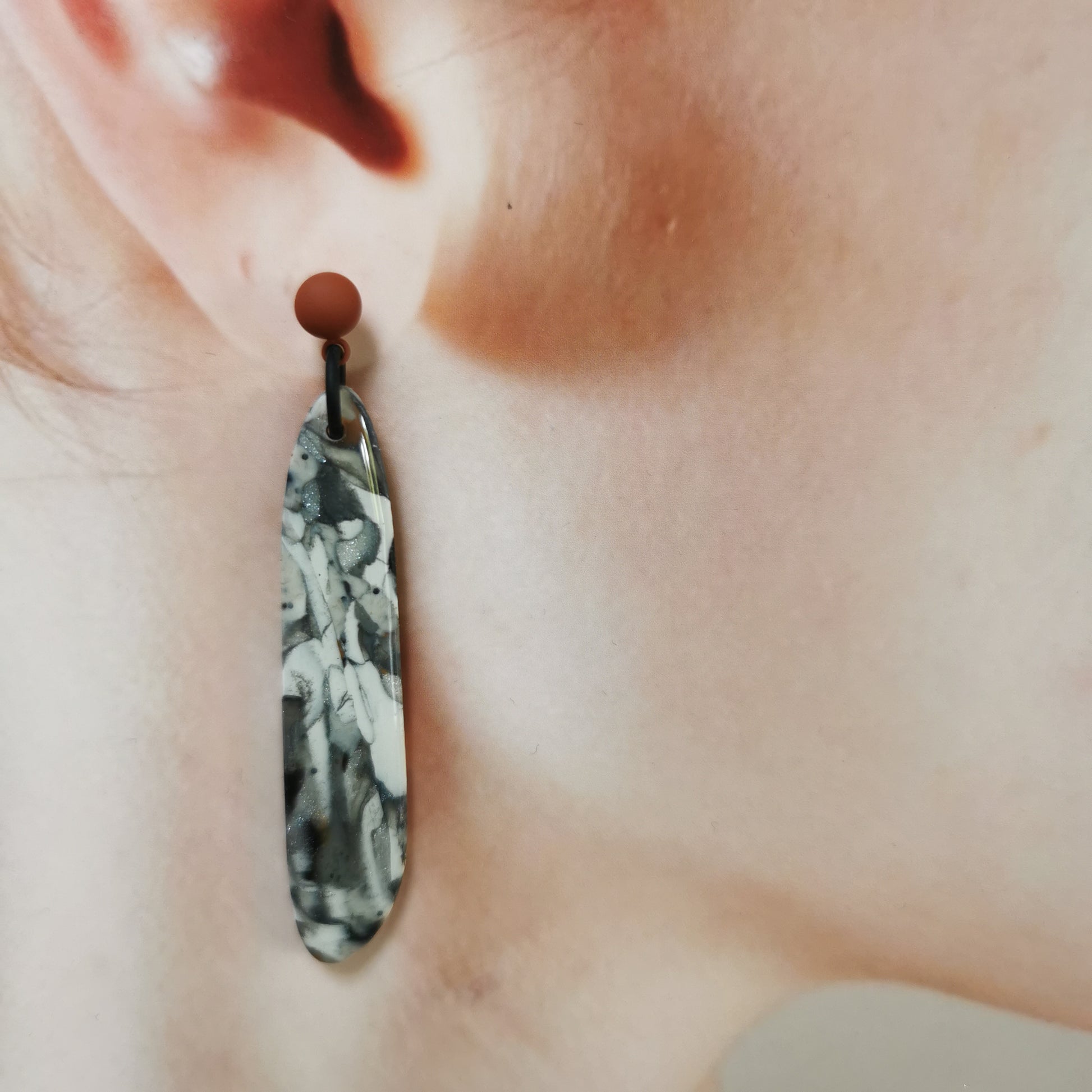Elegante en slanke hanger met bolletje als stekertjes. Terrazzo in shades of Grey met camel kleurige accenten.