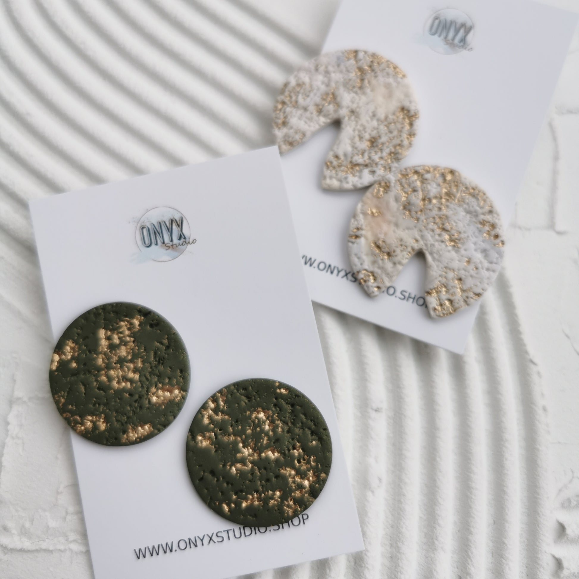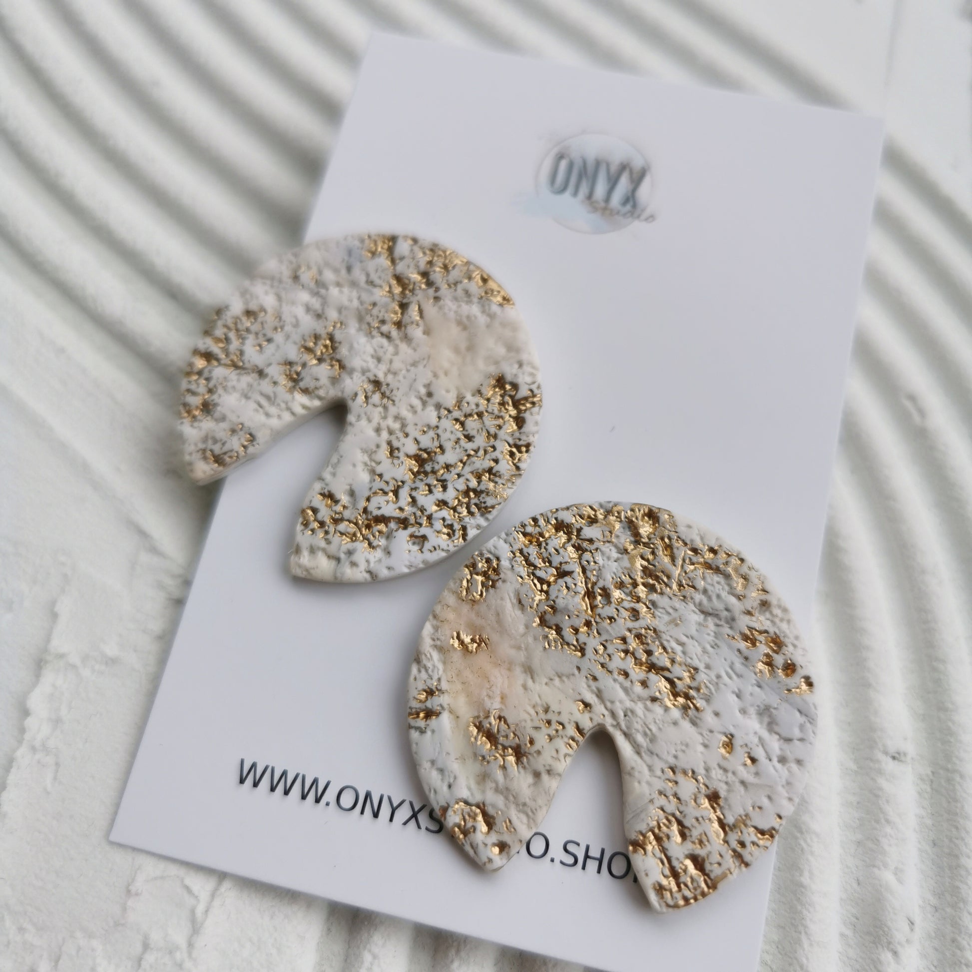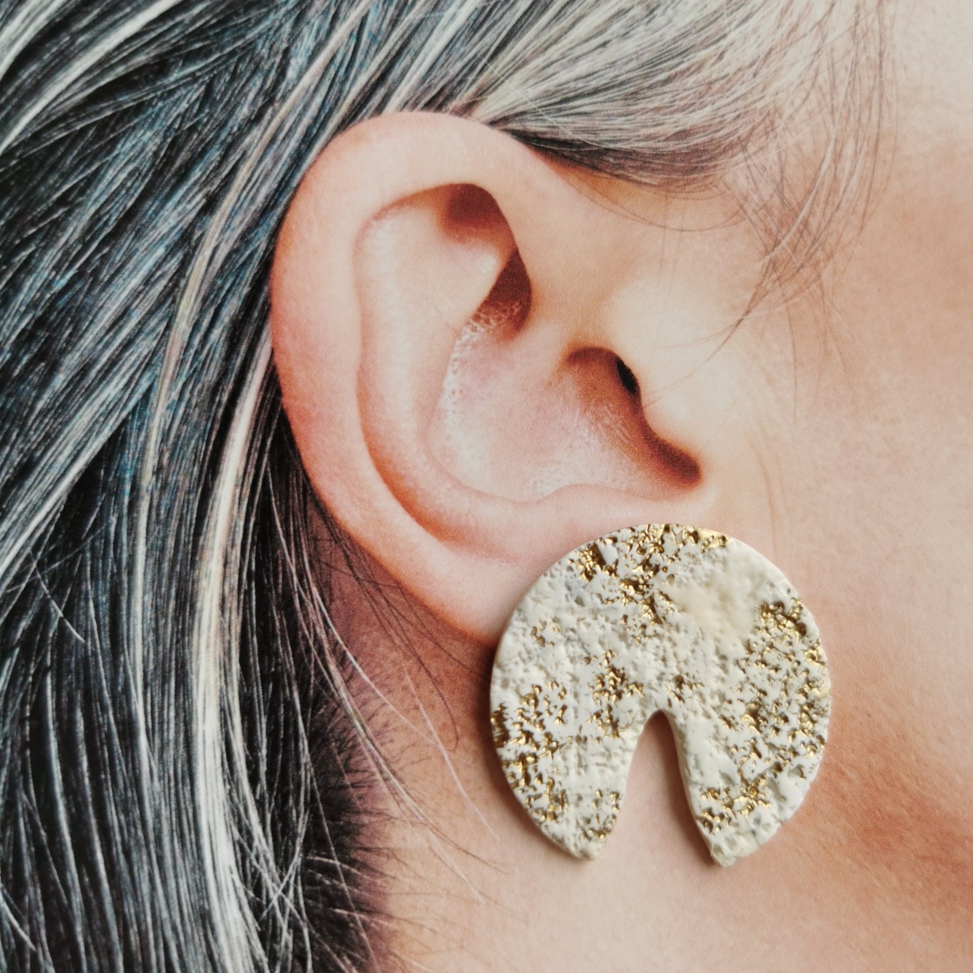 Originele maxistud oorbel met grove textuur en gouden details. De handgemaakte textuur geeft deze oorbel een heel organische uitstraling,de gouden details maken het een statement stud. Voor wie houdt van understated statement,deze is voor jou! Diameter ongeveer 4cm