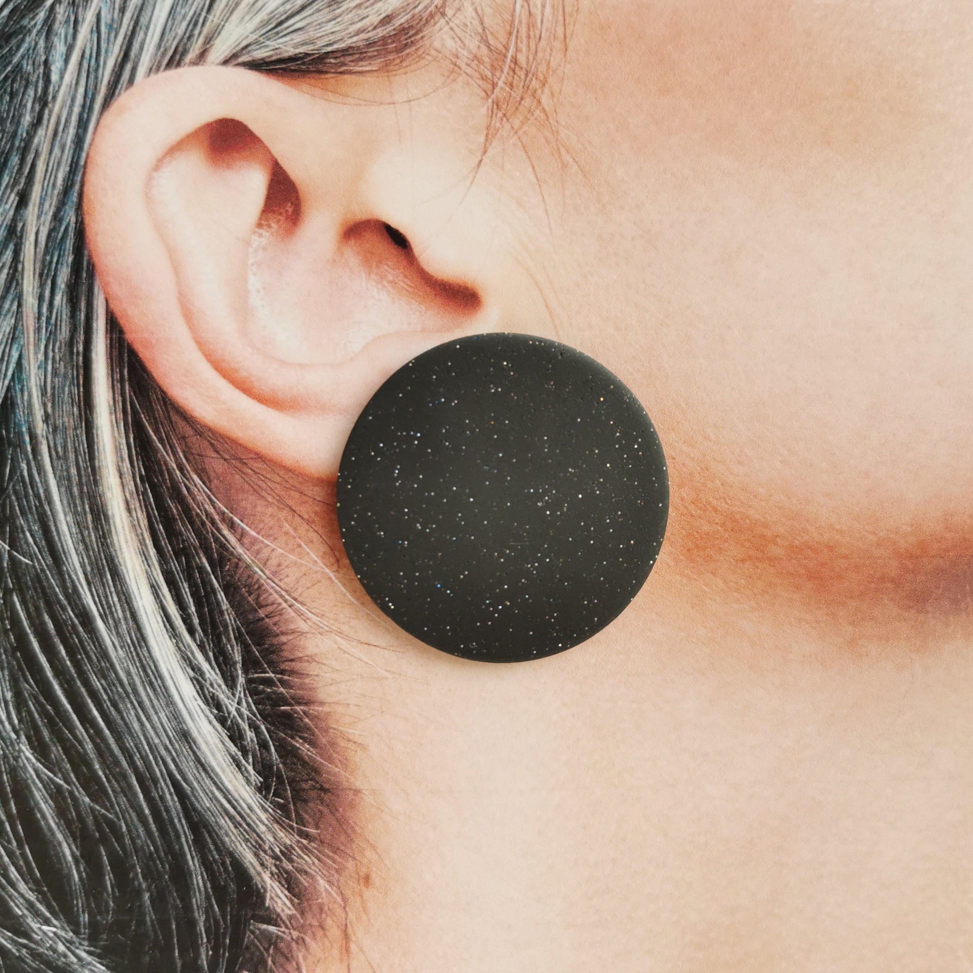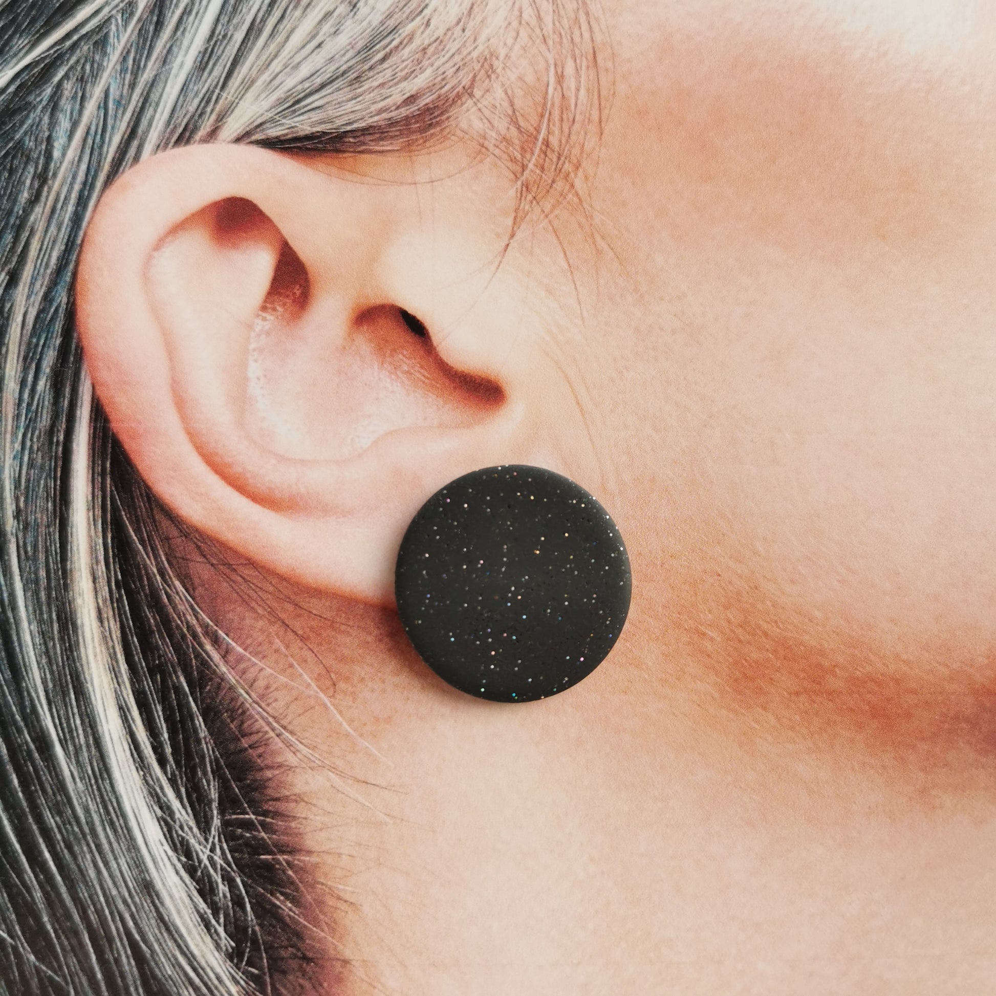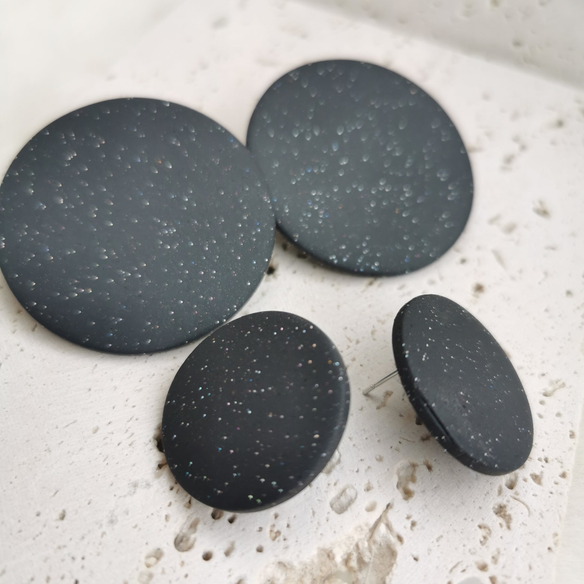 Voor wie houdt van een subtiele glitter zijn deze matte oorbellen perfect! Een matzwarte basis met subtiele hologram zilveren glitter.Er zijn 2 formaatjes beschikbaar. De maxi is ong.5cm en de kleine stud een 2,5cm.