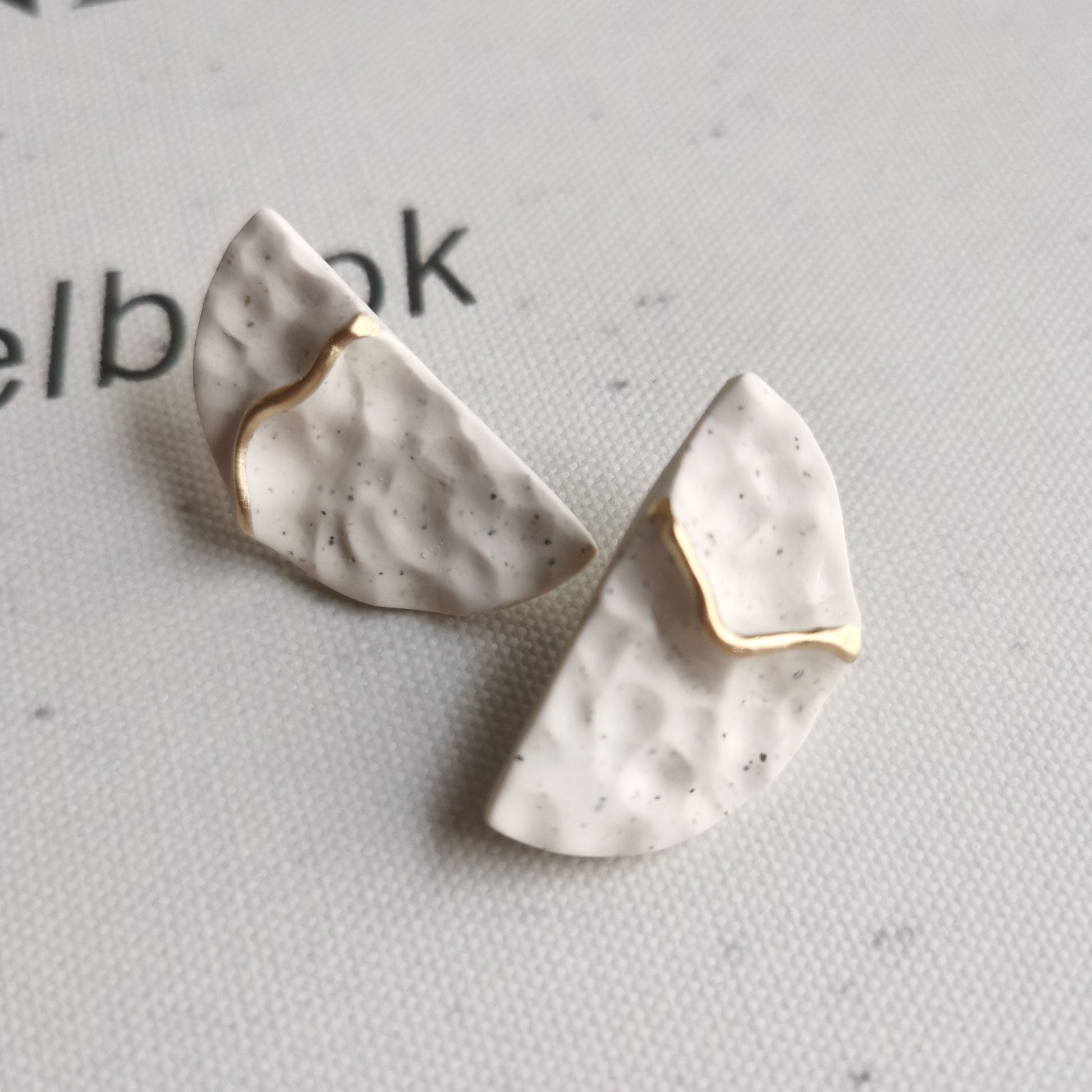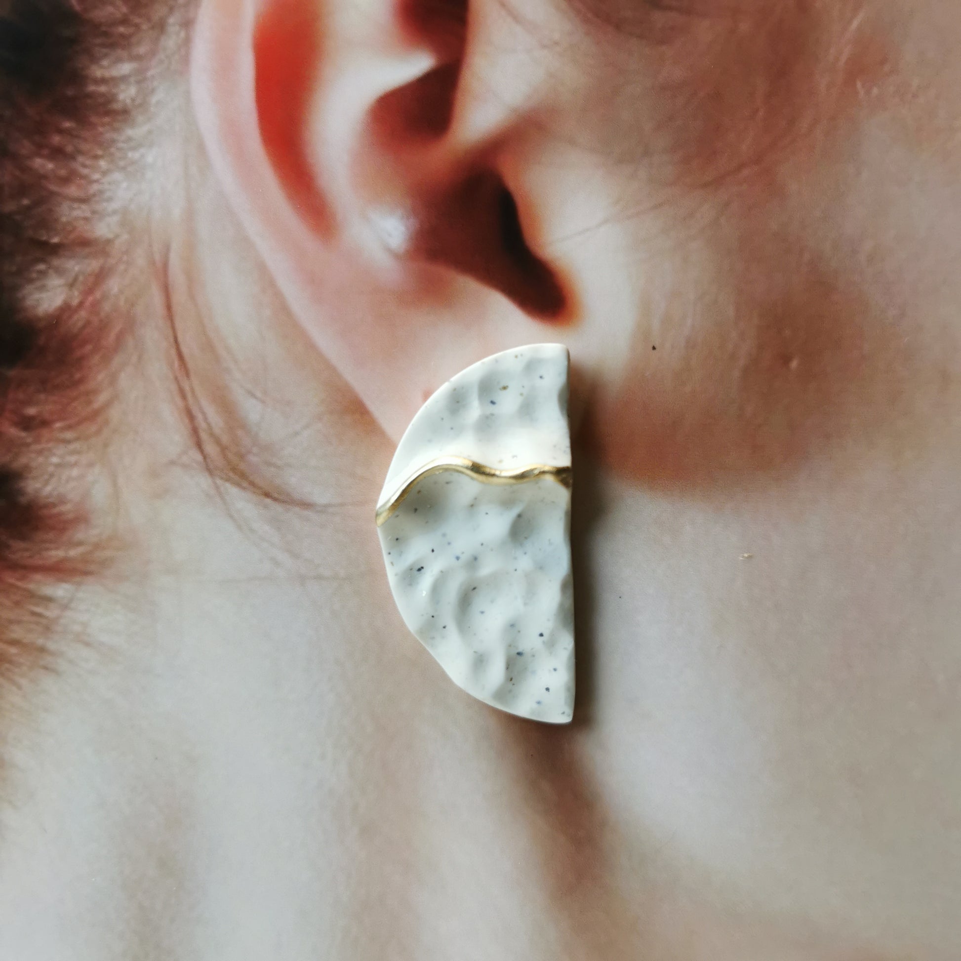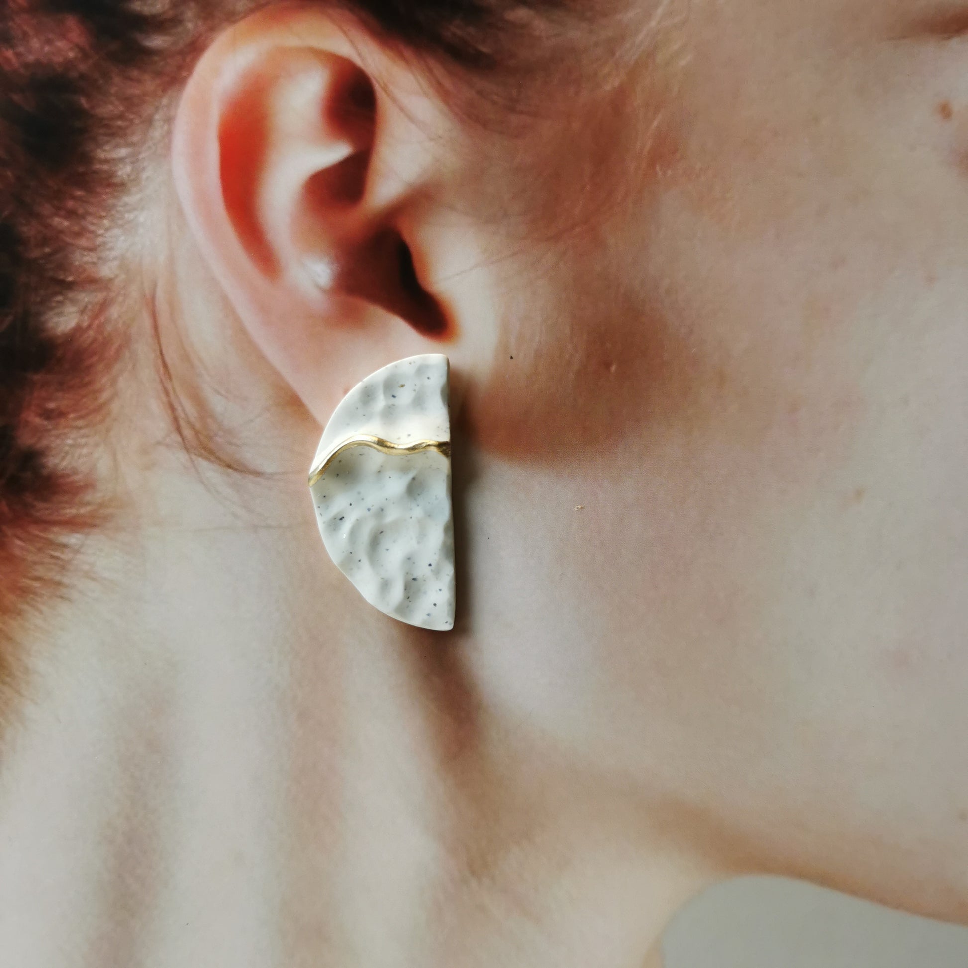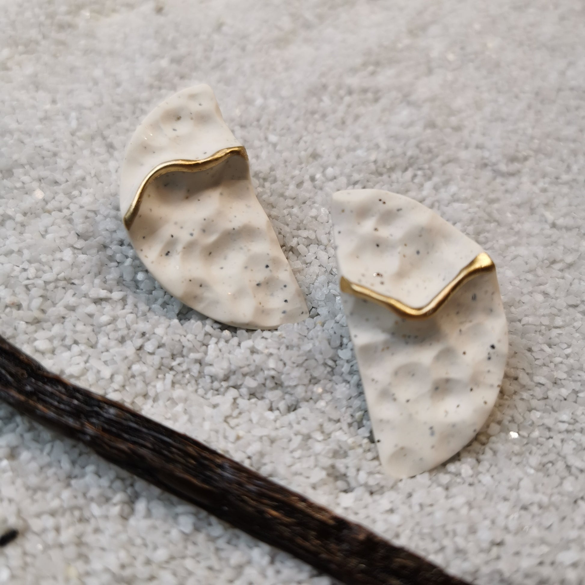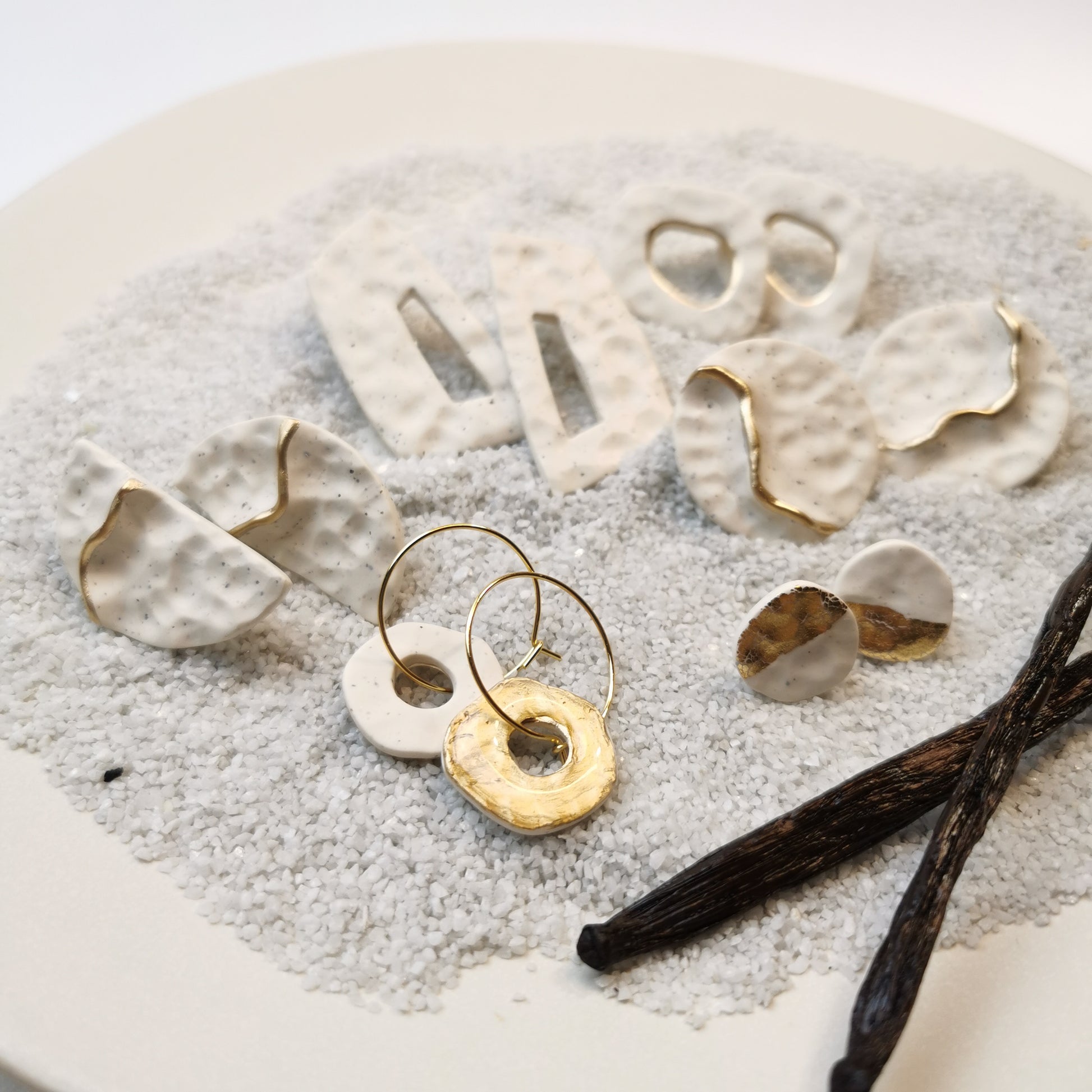 Collectie 'VANILLA' Deze collectie komt van de phrase: Don't be so Vanilla. Een lijn met zacht warm vanille, een doodgewone kleur, maar met een edge. Door de gehamerde structuur, het relief en het gouden accent of aparte vorm is deze oorbel niet zomaar een oorbel. Lengte stud is 3cm.
